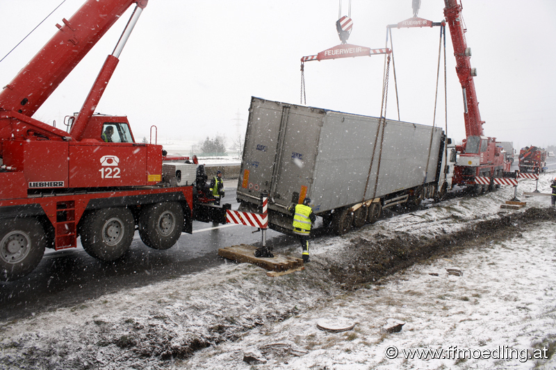 | Tätigkeit der FF Mödling: | Bergen eines Sattelkraftfahrzeuges mit zwei Kranfahrzeugen |