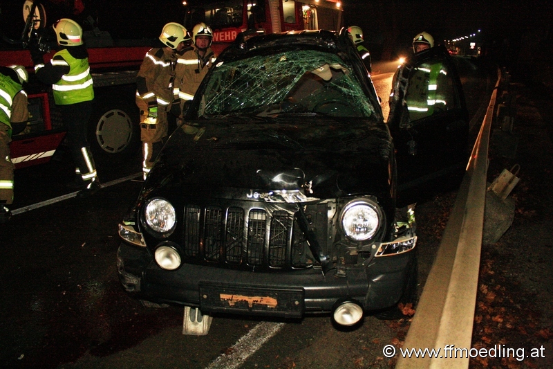 Aus bisher ungeklärter Ursache verlor der Lenker eines Pkw's auf der Guntramsdorferstrasse die Kontrolle über sein Fahrzeug, prallte gegen die Leitschiene und kam seitlich zum liegen. Der Fahrer blieb unverletzt und konnte sich selbst aus dem Fahrzeug befreien. Da der Pkw knapp an der Leitschiene lag, wurde dieser zuerst mittels Seilwinde zur Fahrbahnmitte gezogen und im Anschluss händisch wieder auf die Räder gestellt. Danach wurde die Batterie des Fahrzeuges abgeklemmt und der Pkw mittels Last 3 geborgen.