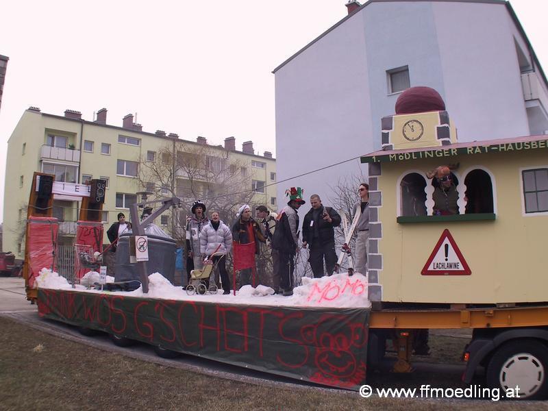 Auch die Freiwillige Feuerwehr der Stadt Mödling schafft es immer wieder - trotz unzähliger Einsatz-, Übungs- und Arbeitsstunden - einen Wagen für den Umzug auf die "Räder" zu stellen.