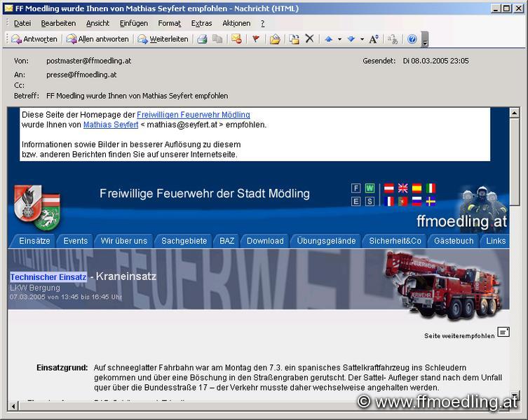 Die Zugriffe auf unsere Homepage zeigen, dass immer mehr Besucher www.ffmoedling.at als tägliche Info-Quelle nutzen. Um noch mehr Interaktivität zu bieten, können unsere stets aktuellen Einsatzberichte jetzt auch als eMail versendet werden!