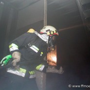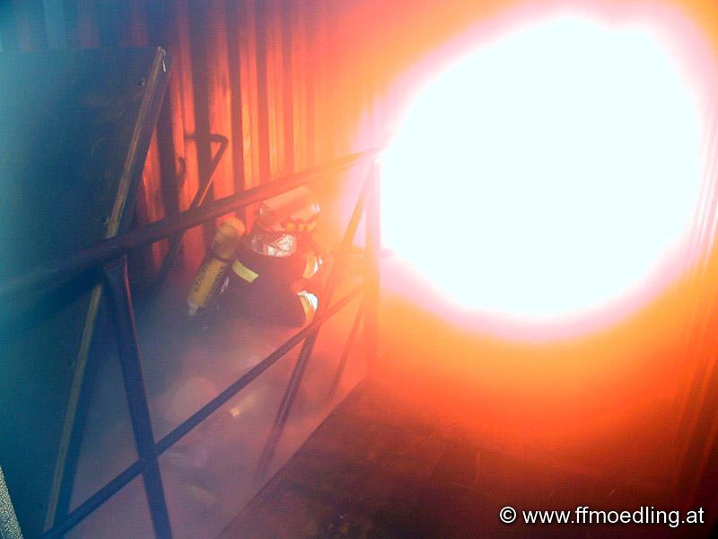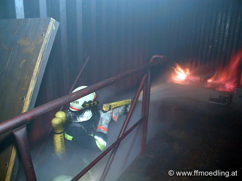 Der Übungsablauf und die Simulationsanlage wurden von 2 bzw. 3 Mann der FF Mödling (mit Atemschutz) im Containerhaus überwacht, gesteuert und dokumentiert.