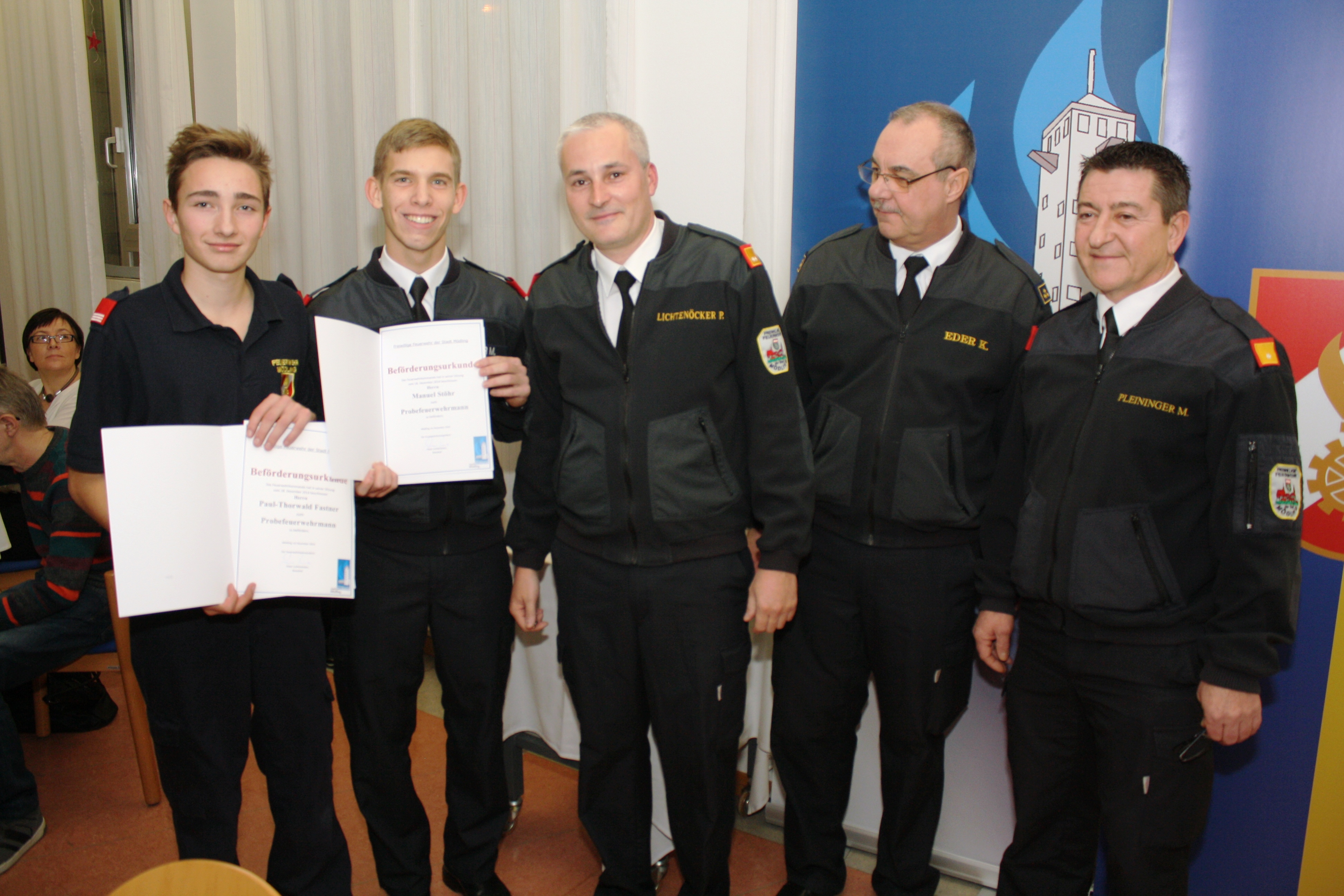 Nach dem Totengedenken und einem kurzen Rückblick auf das zu Ende gehende Feuerwehrjahr durch ABI Michael Pleininger wurden Manual Stöhr und Paul-Thorwald Fastner, die aus der Feuerwehrjugend in den Aktivdienst überstellt wurden, unter dem Beifall der Anwesenden angelobt und zu Probefeuerwehrmännern ernannt.