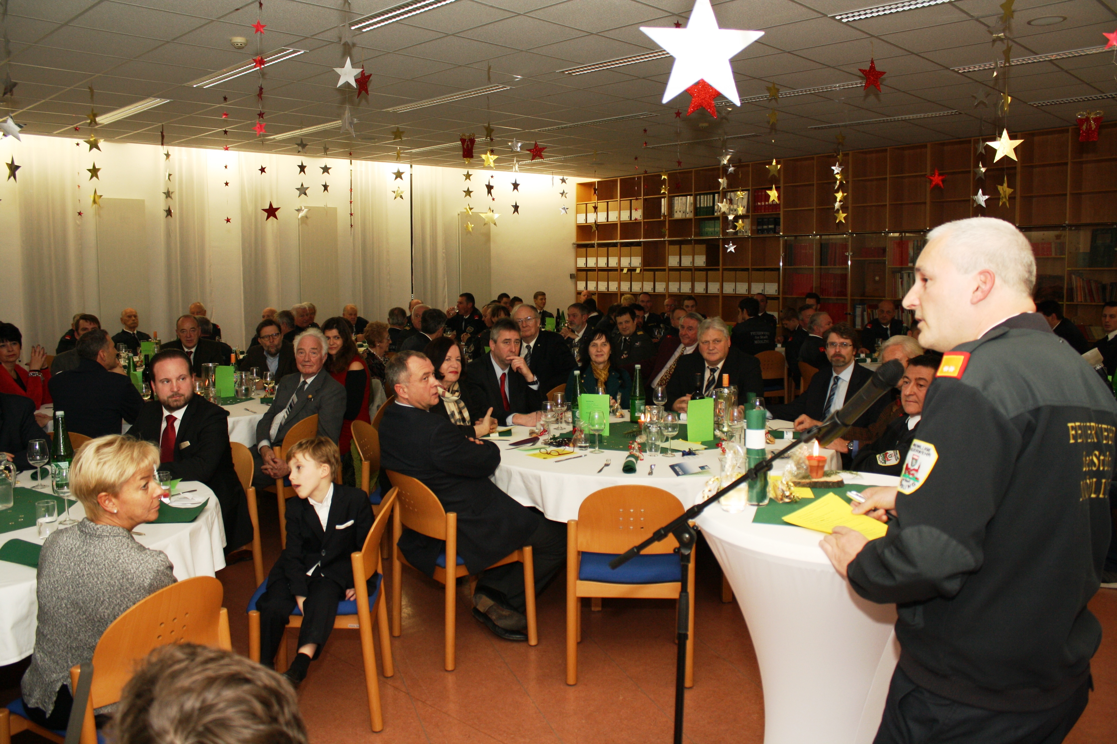 Einen bis auf den letzten Platz gefüllten Saal gab es bei der heutigen vorweihnachtlichen Feier, bei der Kommandant Peter Lichtenöcker auch eine sehr große Anzahl von Ehrengästen im Feuerwehrhaus willkommen heißen konnte.