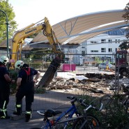 Am Bahnhofplatz wurde heute der zweite Waggon demontiert. Während der Abrissarbeiten wurde eine Gasleitung beschädigt, sodass ein Polokalrohr zu brennen begann.