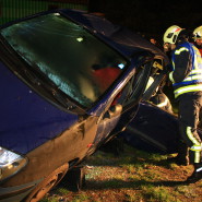 Ein Verkehrsunfall mit 2 PKW, wobei ein Wagen schräg auf der Motorhaube des anderen Fahrzeuges zum Stehen kam. Insgesamt sind drei Personen eingeklemmt. Zusätzlich stellte sich heraus, dass bei einem, in der Nähe abgestellten Anhänger eine unbekannte Flüssigkeit austritt.