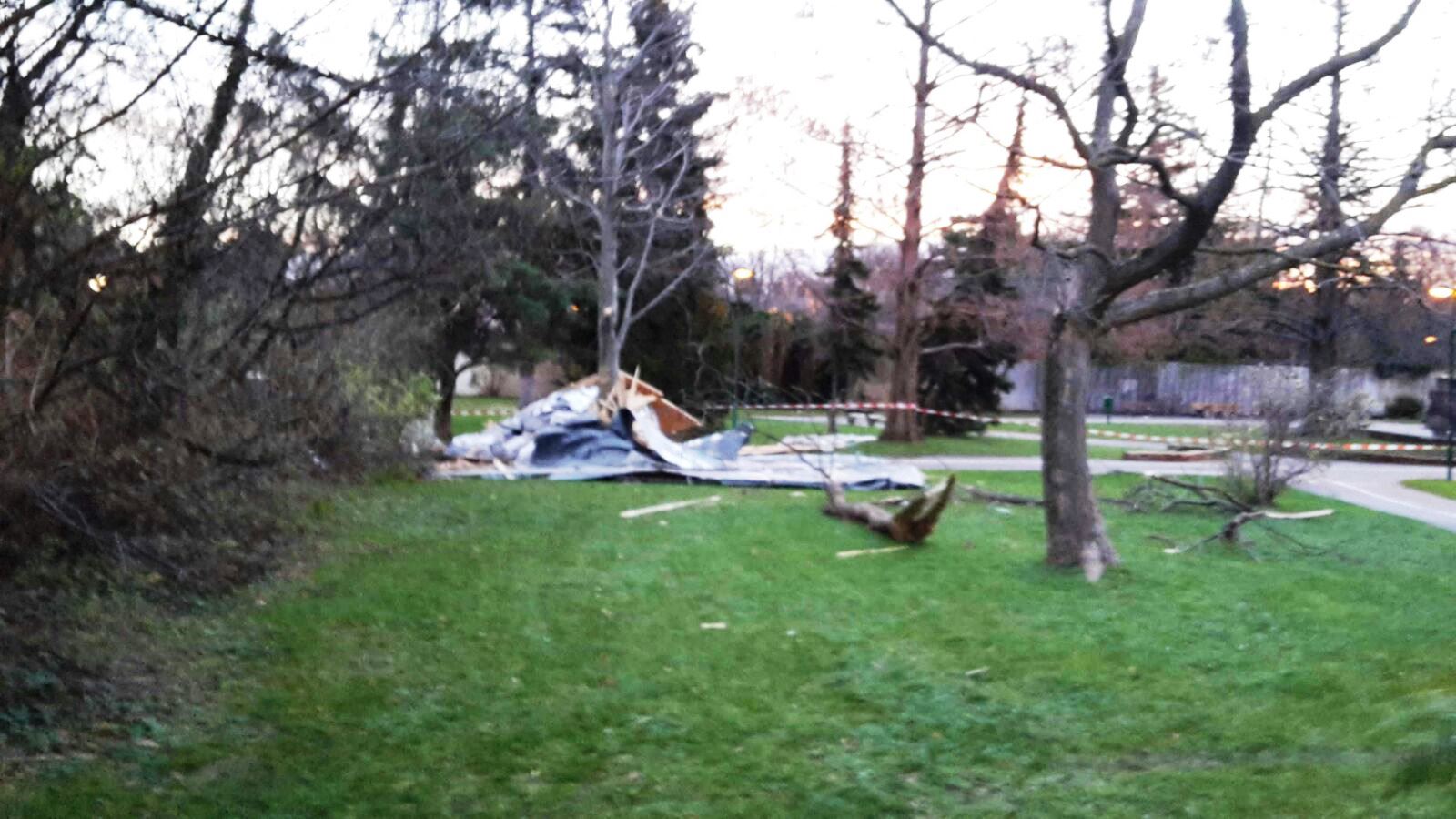 Der Sturm hatte das Dach eines Hochhauses in der Skribanygasse abgedeckt, Teile des Daches stürzten auf den benachbarten Kindergarten in der Lerchengasse bzw. landeten im Museumspark.