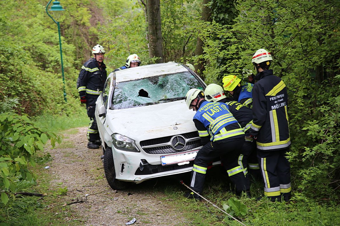 Beim Eintreffen der Feuerwehr war kein Fahrer des PKWs anwesend, das Fahrzeug lag nach einem Sturz über eine Böschung am Dach, und eine Laterne der öffentlichen Beleuchtung war ebenfalls beschädigt worden. Der PKW wurde zunächst mit der Seilwinde von Last 1 (ASP) gesichert und wieder auf die Räder gestellt, um in weiterer Folge geborgen und auf das Abschleppfahrzeug verladen zu werden.