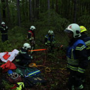 Übungsannahme war eine bei Holzschlägerungsarbeiten im Wald unter einem Baum eingeklemmte und verletzte Person. Nach der Erkundung durch den Übungsleiter wurde beschlossen, den Baum zunächst gegen ein weiteres Abrollen zu sichern, und anschließend mit Hebekissen anzuheben, um die Person befreien zu können.
