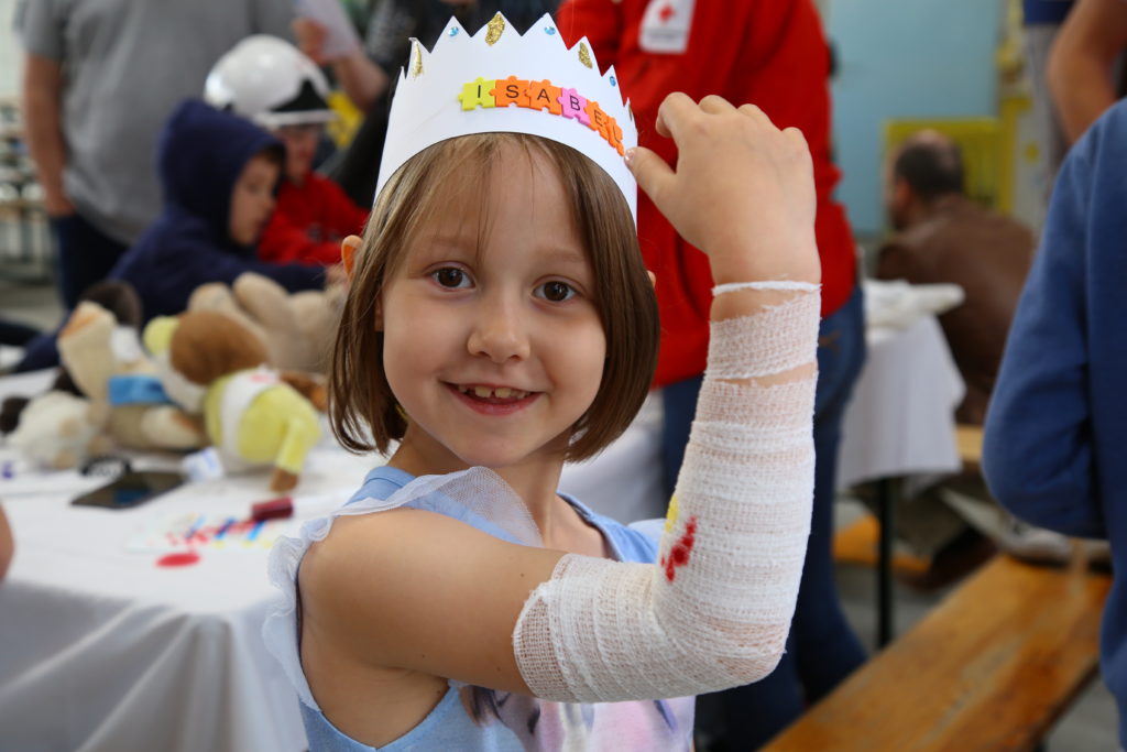 Nach kurzer Zeit sah man schon viele professionell verarztete Kinder... glücklicherweise hat sich jedoch niemand wirklich verletzt, sondern die Schau-Verbandstation des Roten Kreuzes zeichnete für die zahlreichen Bandagen und Pflaster verantwortlich. Im Rahmen dieser Station wurde am Vormittag auch unser Kommandant Branddirektor Peter Lichtenöcker vom Bezirksstellenleiter des Roten Kreuzes Landesrettungsrat Michael Dorfstätter zum Ehrenmitglied des Jugendrotkreuzes ernannt.