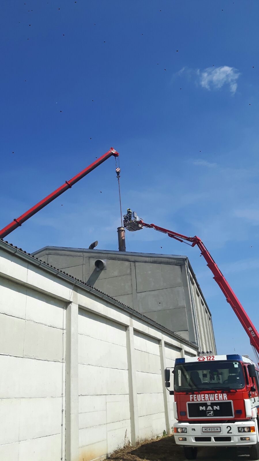 Im Zuge der Löscharbeiten wurde festgestellt dass ein ca. 5 m hoher Rauchfang am Dach einer Halle durch den Brand so stark beschädigt wurde, dass er abgebaut werden musste. Dafür wurde zusätzlich das schwere Kranfahrzeug der FF Mödling sowie ein WLF mit dem Kranbegleitcontainer um kurz nach 09:00 Uhr angefordert.