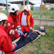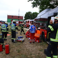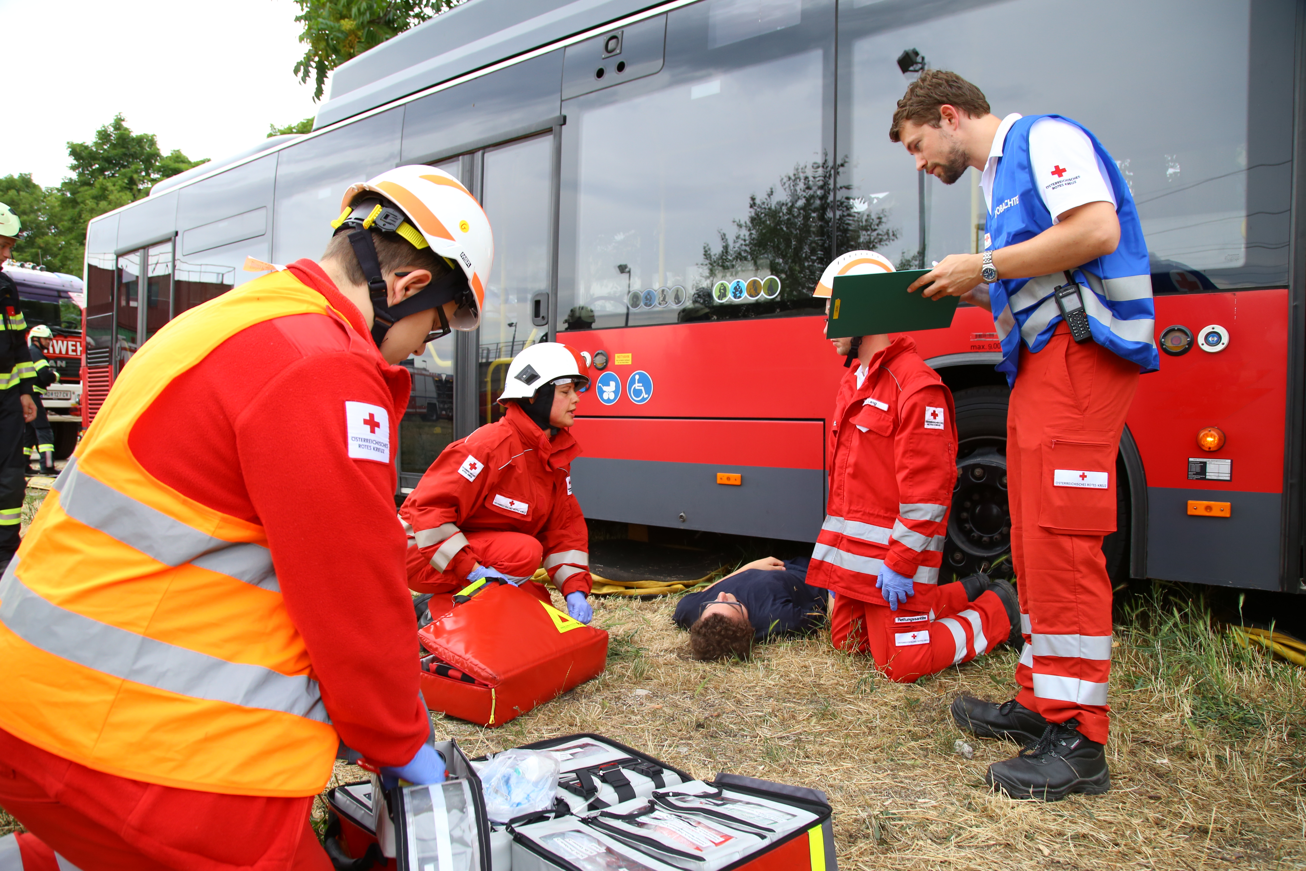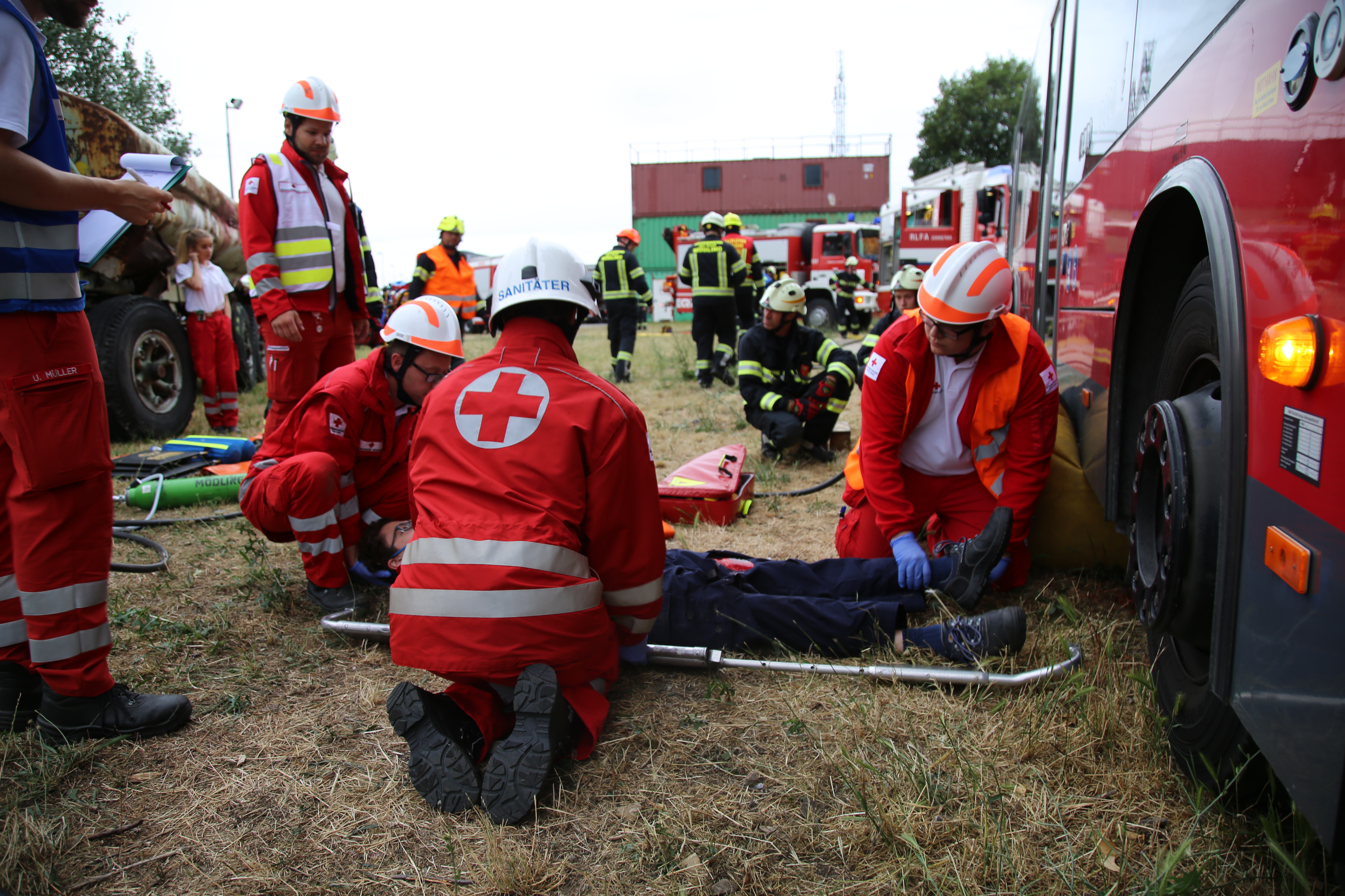 Von der Mannschaft der eintreffenden Fahrzeuge Tank 3, Rüst 1, Tank 1 und Tank 4 wurden sogleich Maßnahmen zur Menschenrettung in Abstimmung mit dem Rettungsdienst vorgenommen, nachdem der Brandschutz aufgebaut war und der umgekippte Bus gegen ein weiteres Kippen oder Wegrollen mit einer Seilwinde gesichert wurde. Einer der Busse wurde mit Hebekissen angehoben, um die darunter liegende Person befreien zu können. Während der Rettungsmaßnahmen steigerten zwei durch Spezialeffekte herbeigeführte Entstehungsbrände an beiden Unfallfahrzeugen die ohnehin schon sehr realistischen Bedingungen.