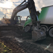 Nach Aufstellen von Kran Mödling wurde der Sattelauflieger angehoben und mit einem Bobcat Bagger das Erdreich unter dem LKW entfernt.