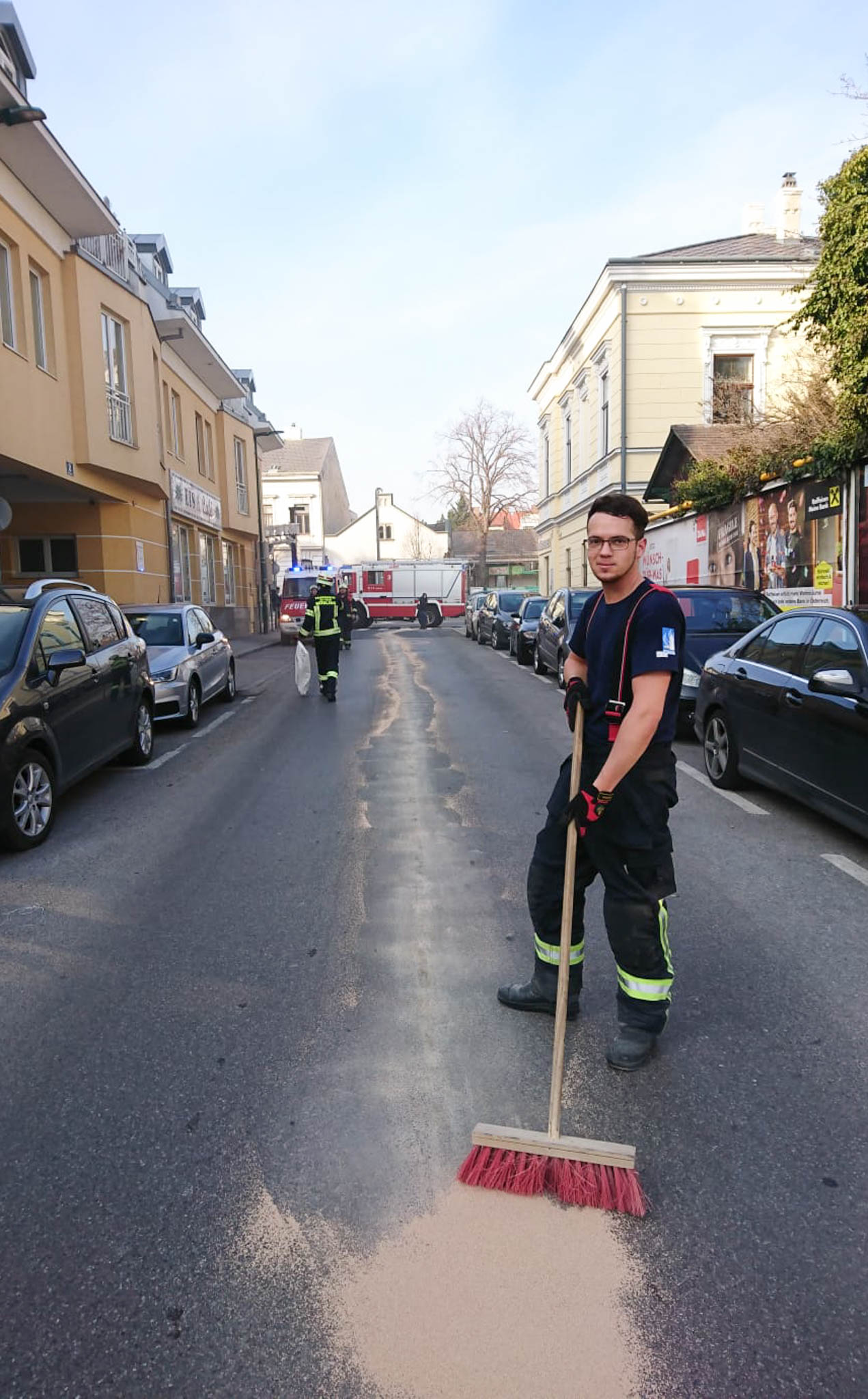 Zusätzlich wurde eine Kehrmaschine der Stadtgemeinde Mödling vom Einsatzleiter angefordert, um Ölbindemittelreste auf der Fahrbahn gänzlich zu beseitigen.