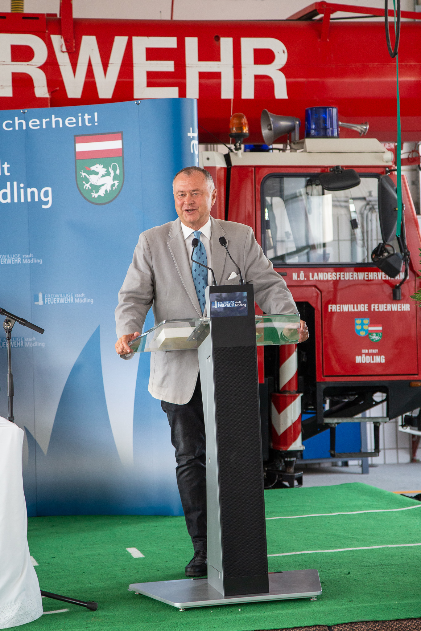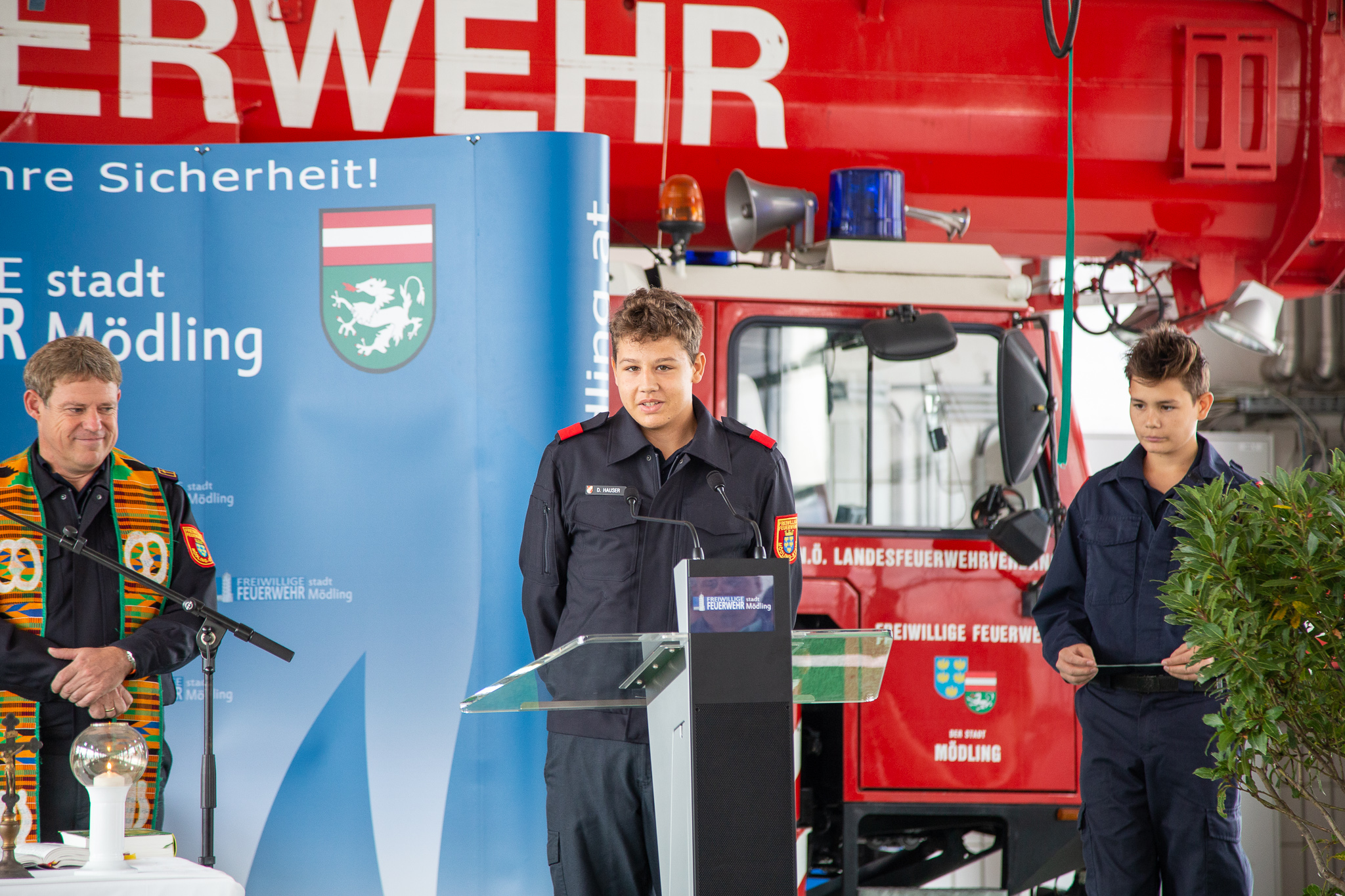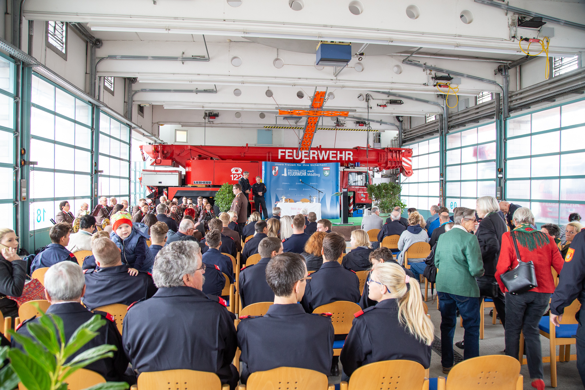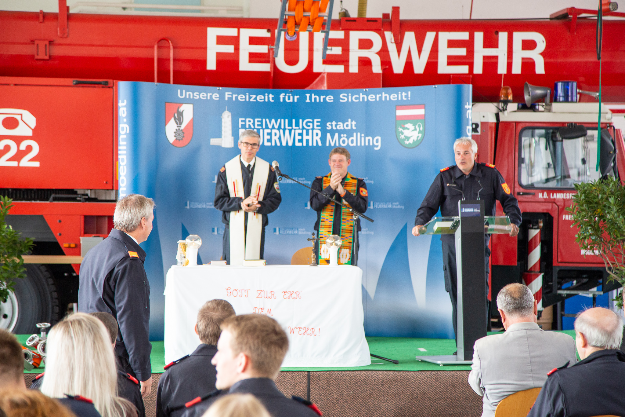Die Feuerwehrkuraten Richard Posch und Markus Lintner gestalteten gemeinsam einen konfessionsübergreifenden ökomänischen Gottesdienst in der von den Feuerwehrkameraden liebevoll geschmückten Fahrzeughalle. Zahlreiche Besucher, darunter auch viele Ehrengäste, folgten der Einladung und nahmen an einem dafür eher unüblichen Ort am Gottesdienst teil. Kommandant Peter Lichtenöcker begrüßte alle Gäste persönlich und kündigte im Zuge dessen ein großes Feuerwehrfest der Feuerwehr Mödling im kommenden Jahr an. Während des gesamten Festbetriebes sorgte die Feuerwehrkapelle Reisenberg für musikalische Unterhaltung.