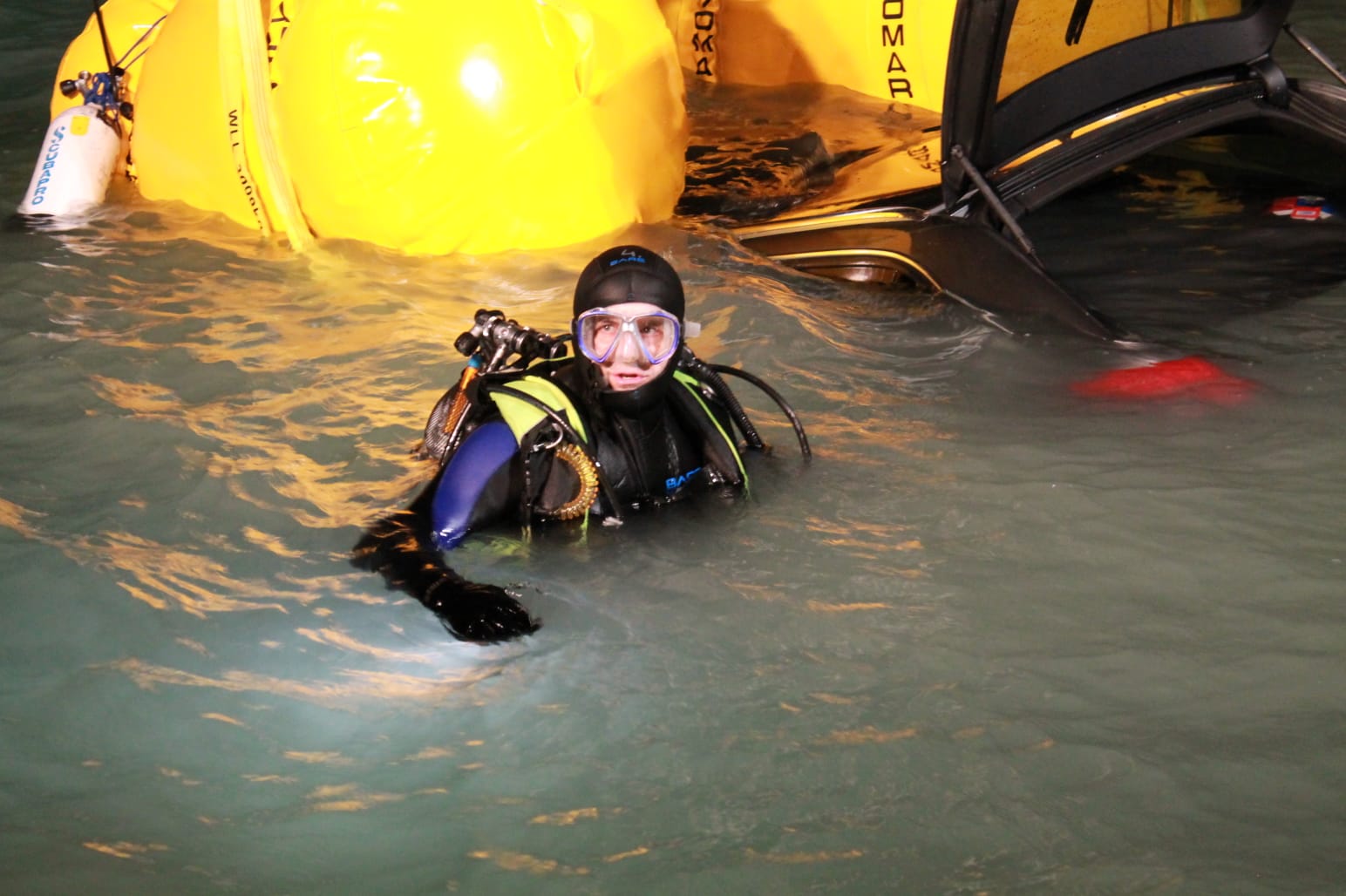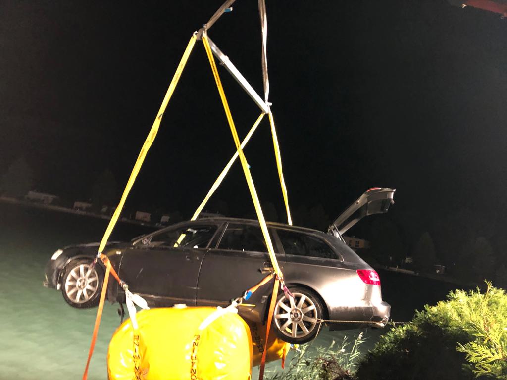Bereits nach ca. 30 min befand sich das Sonderfahrzeug am Einsatzort. Um den PKW zu bergen begaben sich 4 Taucher ins Wasser und brachten zwei Hebeballons am PKW an. Dabei wurden die Einsatzkäfte durch ein Schlauchboot unterstützt. In Folge wurde der PKW durch die Feuerwehr Wiener Neudorf mit dem Kran des Schweren Rüstfahrzeuges aus dem Teich gehoben.