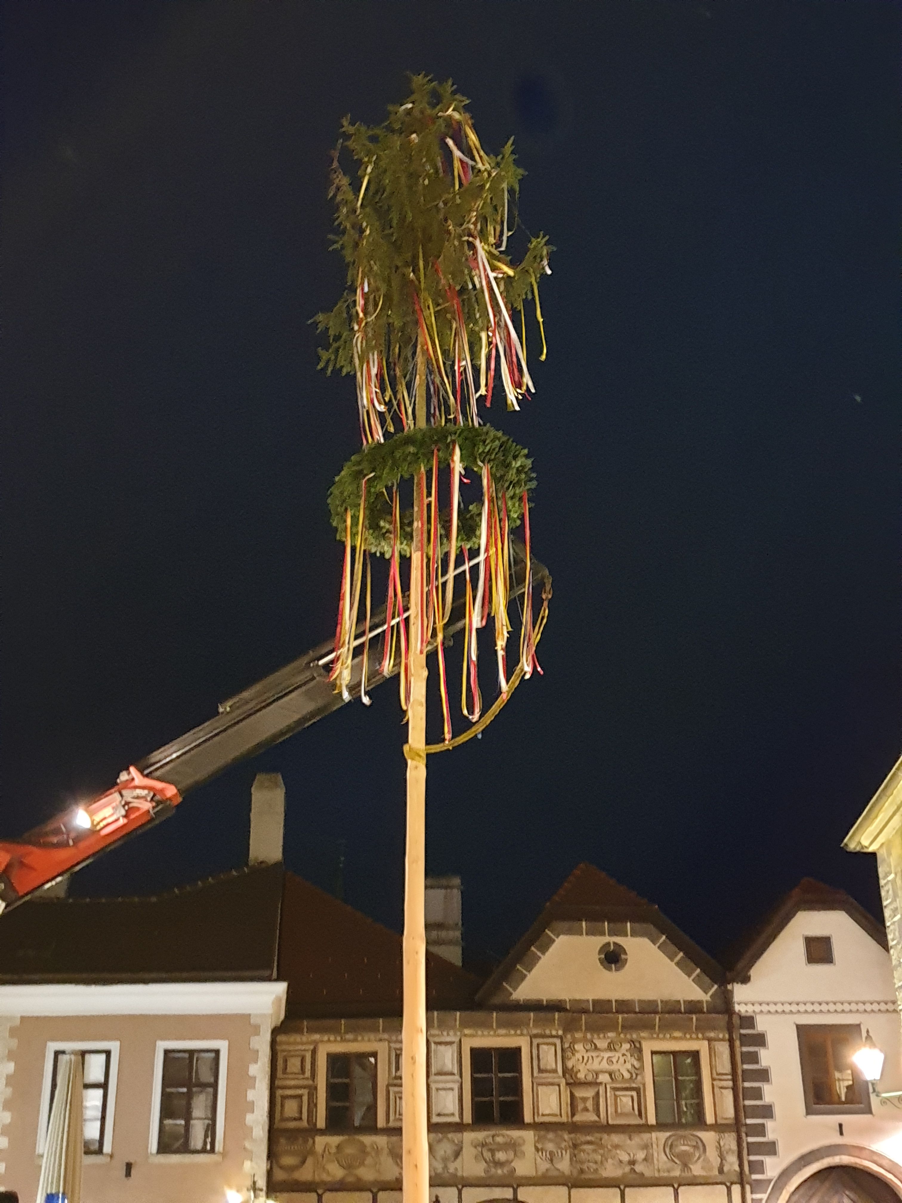 Am Vorabend des 1.Mai wurde durch die Stadtgärtnerei in Zusammenarbeit mit den Gemeindebediensteten, welche bei der Feuerwehr dienstzugeteilt sind, der Maibaum aufgestellt. Die Gemeindebediensteten stellten mit dem Kran des Wechselladerfahrzeuges den Maibaum auf.