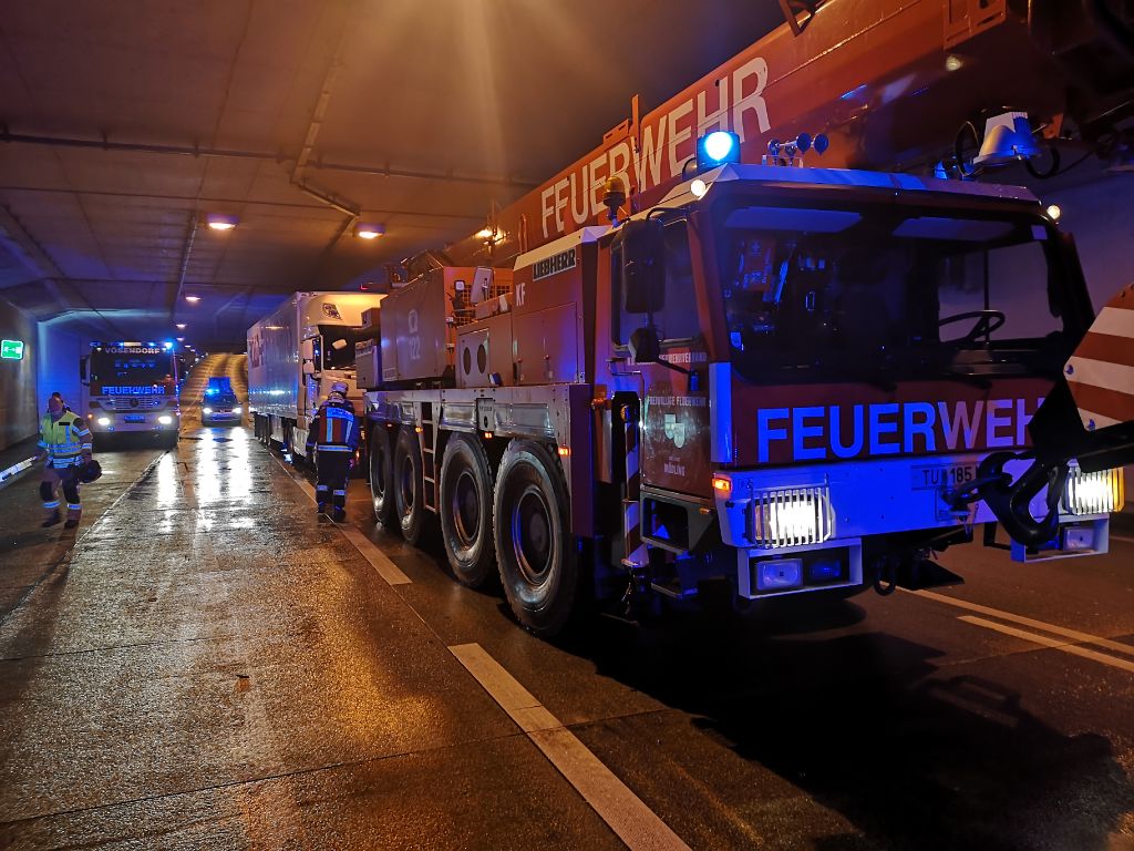 Bereits ca. 1 Stunde nach der Alarmierung konnte der LKW aus dem Tunnel entfernt und der Tunnel wieder freigegeben werden. Im Einsatz standen 2 Fahrzeuge mit 5 Einsatzkräften.