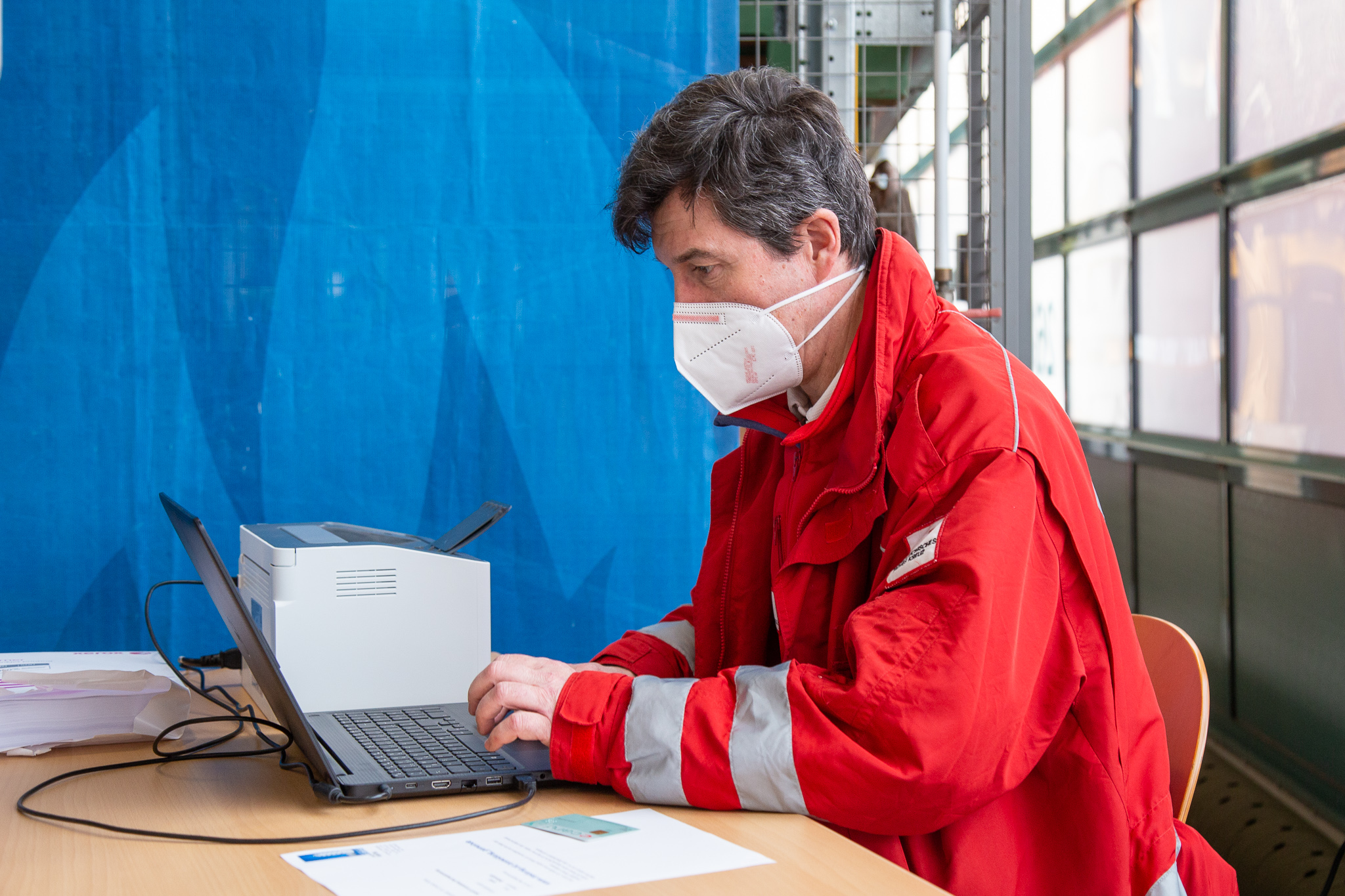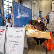 Der in der Garage für Sondereinsatz- und Katastrophenschutzmittel errichtete Teststandort umfasst insgesamt 5 Teststraßen und zwei Möglichkeiten einer Nachregistrierung. Aufgrund des ungebrochenen Andrangs kam es auch hier kurzzeitig zu einer Warteschlage die bis zur Straße reichte.