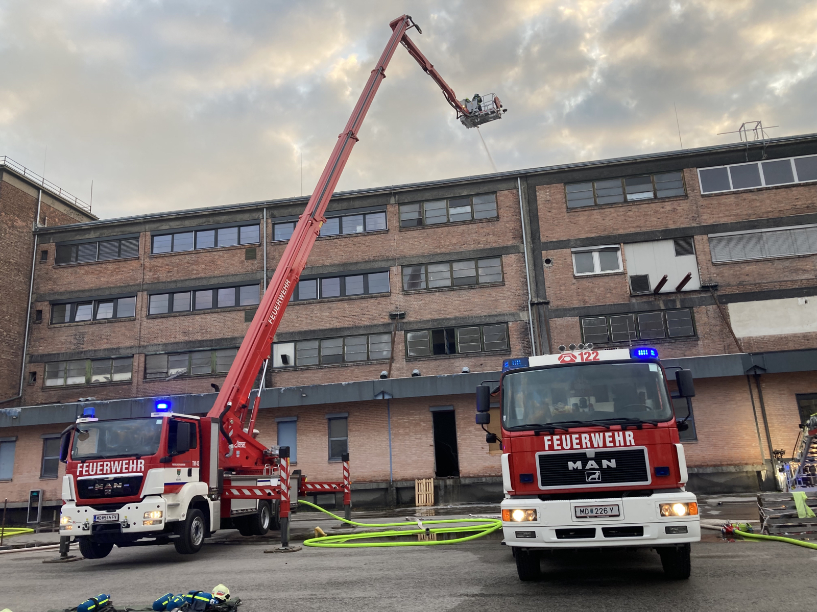 Die örtliche Einsatzleitung forderte das Hubrettungsfahrzeug (Steig) der Feuerwehr Mödling mit Tanklöschfahrzeugen nach. Binnen Minuten konnten mehrere Fahrzeuge zum Einsatzort ins ehemalige Semperitwerk in Wienersdorf ausrücken.