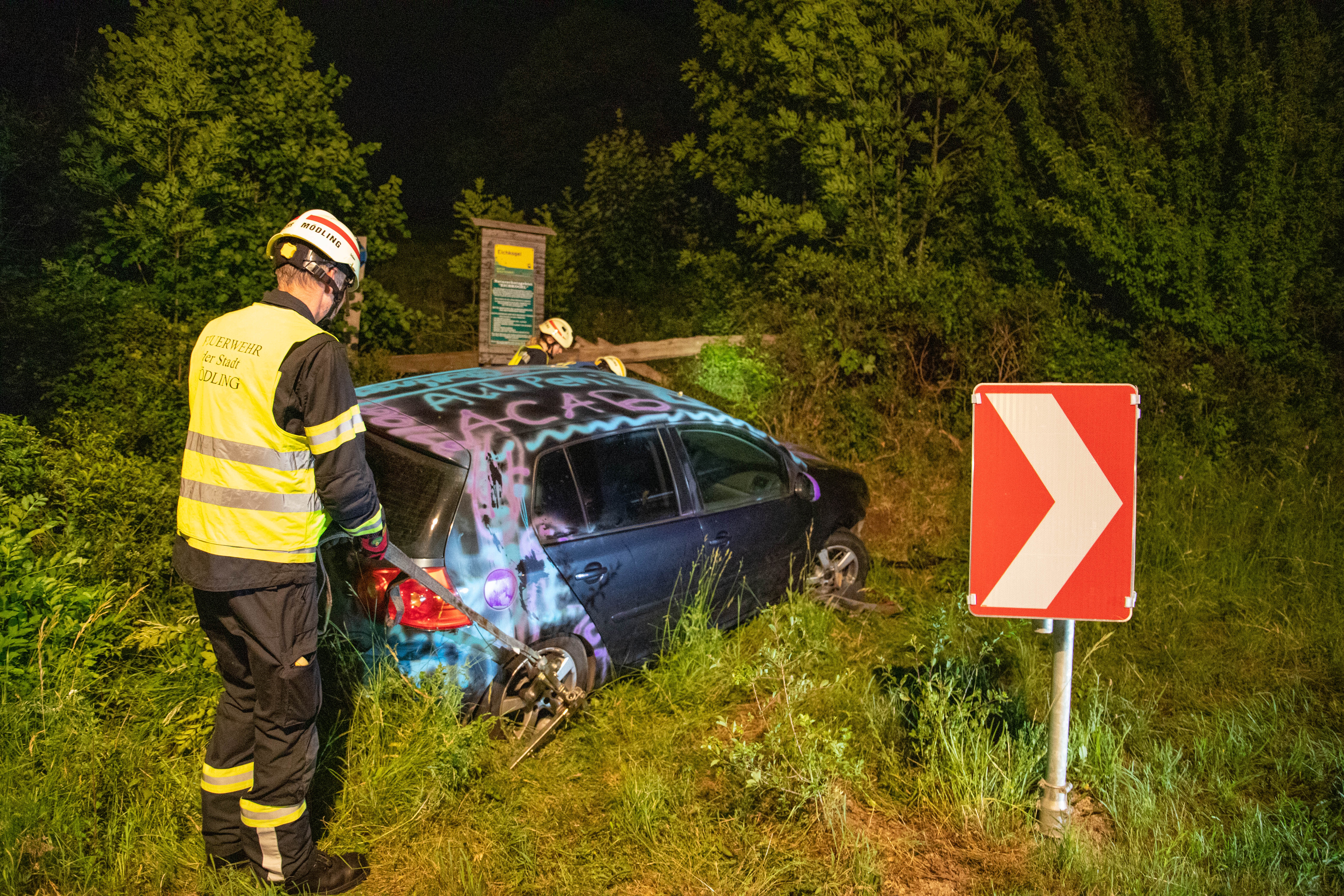 Kurz vor 01:00 Uhr morgens wurde die Freiwillige Feuerwehr Mödling zu einem Verkehrsunfall alarmiert. Auf der Weinbergstraße kam ein Lenker mit seinem PKW von der Fahrbahn ab und landete neben der Fahrbahn im Straßengraben.
