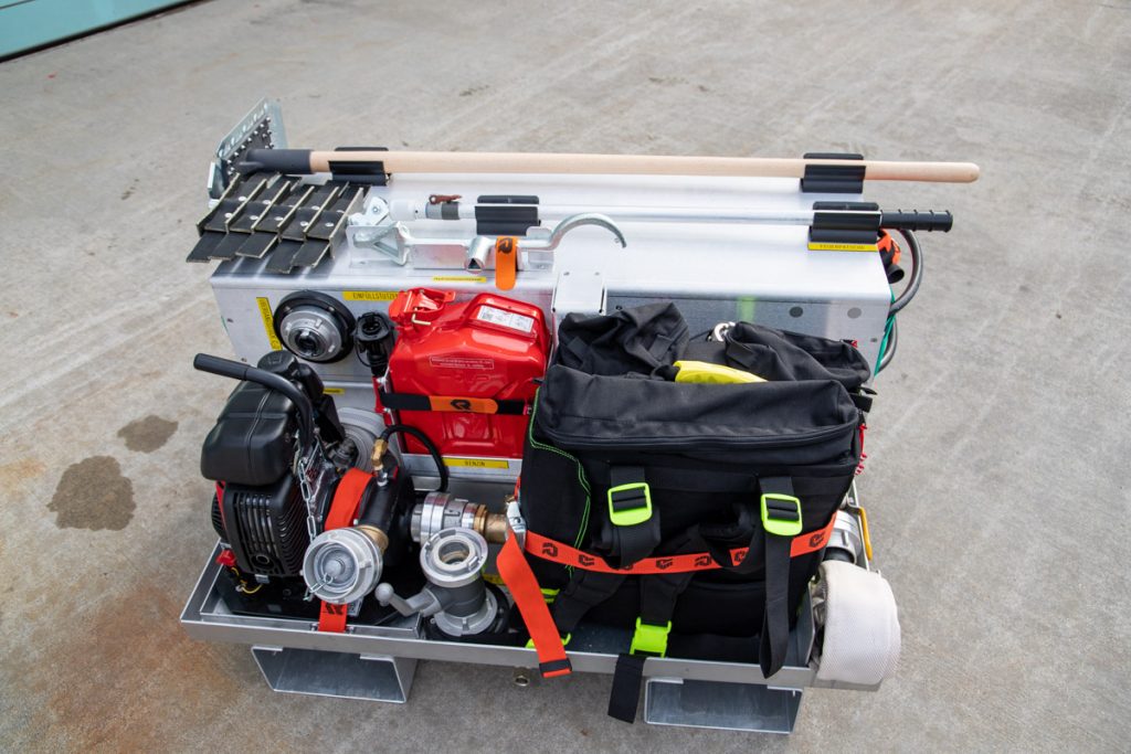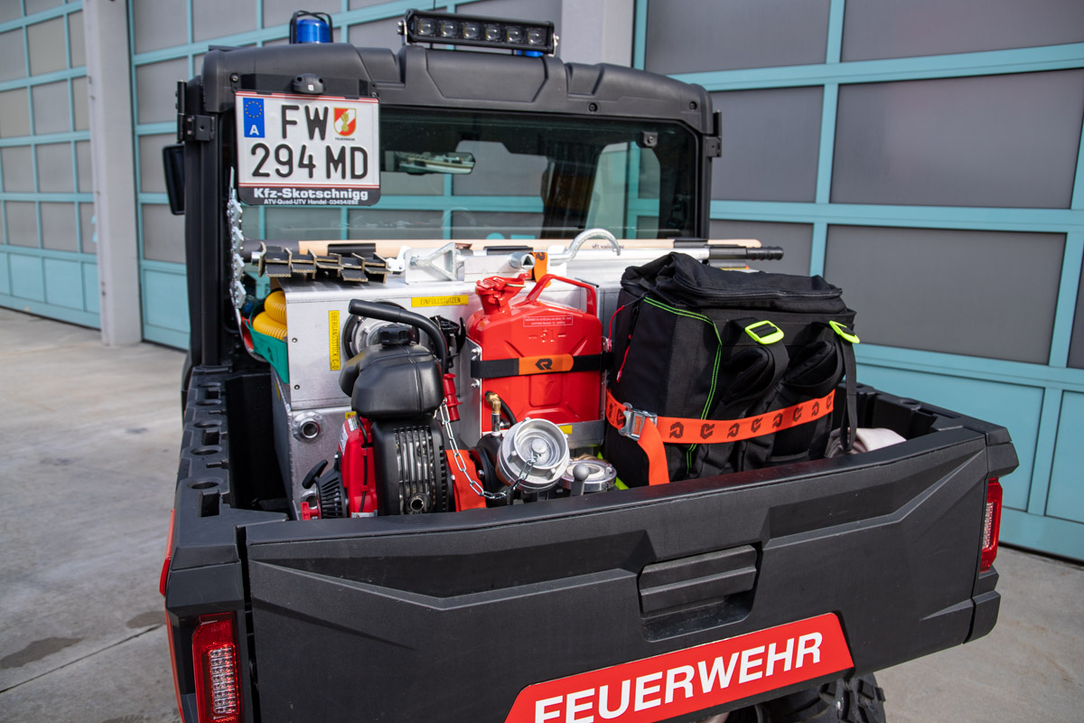 Diese zwei baugleichen Wechselmodule können auf den zwei Sonderfahrzeugen Polaris aufgesattelt werden. Damit kann eine Waldbrandbekämpfung auch im unwegsamen Gelände gewährleistet werden. Neben Equipment zur Waldbrandbekämpfung verfügen die Aufbauten auch über eine Pumpe und einen 100 Liter Wassertank.