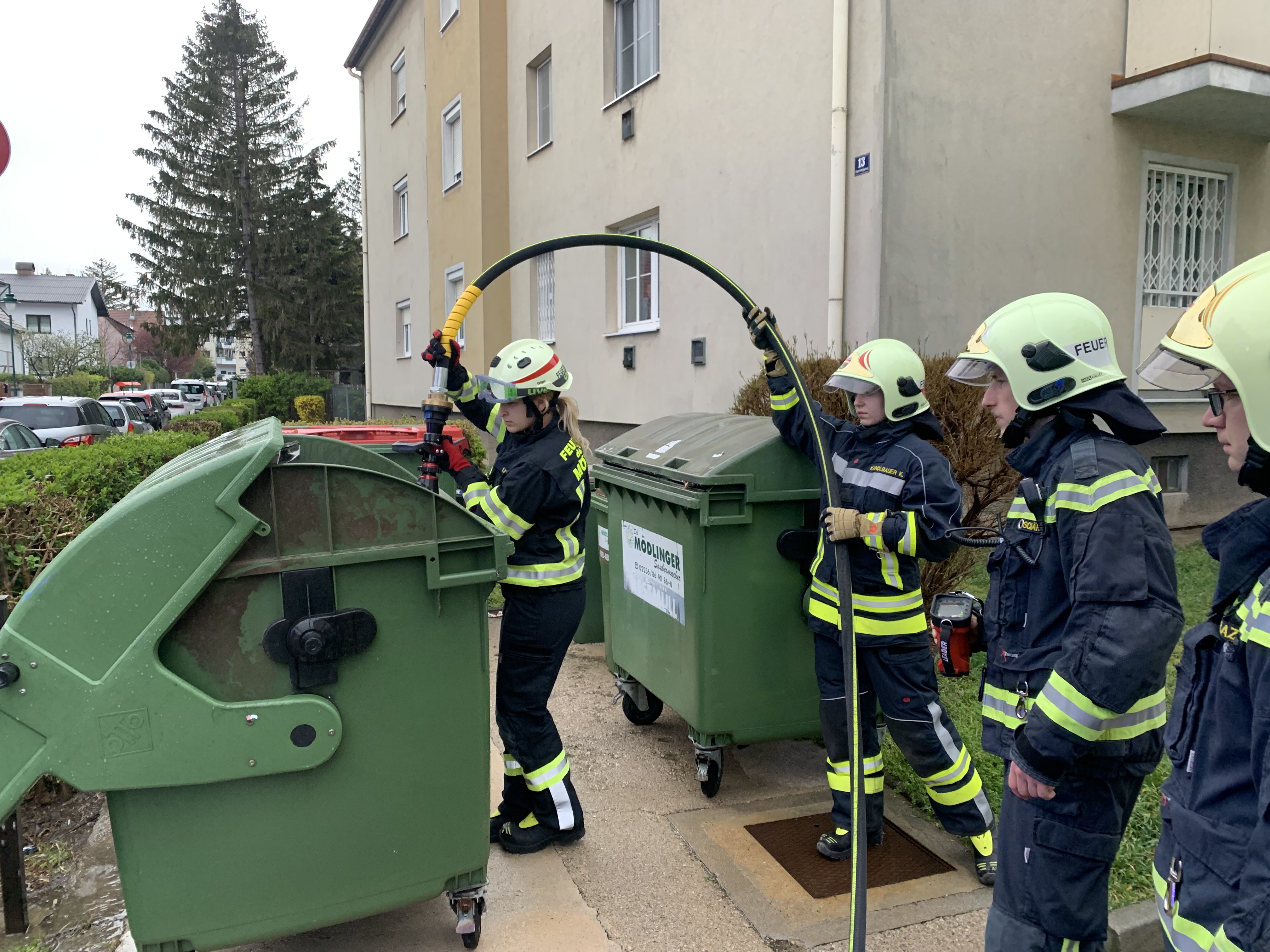 Beim Eintreffen der Einsatzkräfte drang Rauch aus einem Restmüllcontainer. Rasch wurde eine Löschleitung vorgenommen und der Brand abgelöscht. Dabei kam auch eine Wärmebildkamera zum Einsatz.
