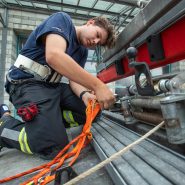 Dabei wurden vier Stationen gebildet. Bei der ersten Station wurden die verschiedenen Knoten in Theorie und Praxis beübt. Auch die Sicherung einer Person über einen Abseilachter mit Prusikknoten wurde erneut gefestigt. Bei der zweiten Station wurde die Verwendung der Steckleiter und der Schiebleiter praktisch geübt. Bei zwei weiteren Stationen wurde eine Menschenrettung über eine Leiter, das Aufziehen von einer Löschleitung und das gesicherte Absteigen über eine Leiter praktisch gefestigt.