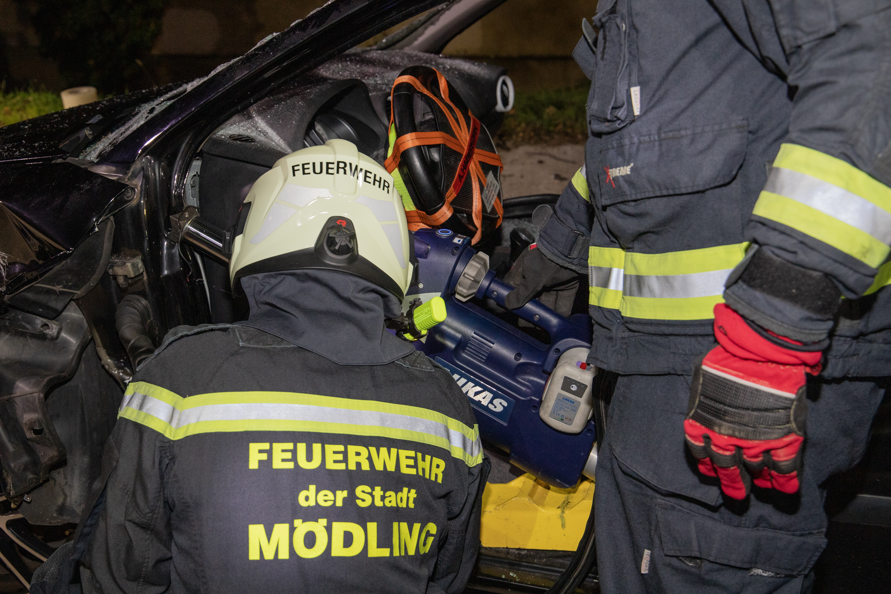 Auch die Handhabung von Schere, Spreizer und Rettungszylinder wurde an einem, für die Übung zur Verfügung stehenden PKW, ausgebildet. Hier wurden verschiedene Techniken, wie beispielsweise das Schaffen einer Seitenöffnung zur Personenrettung erlernt.