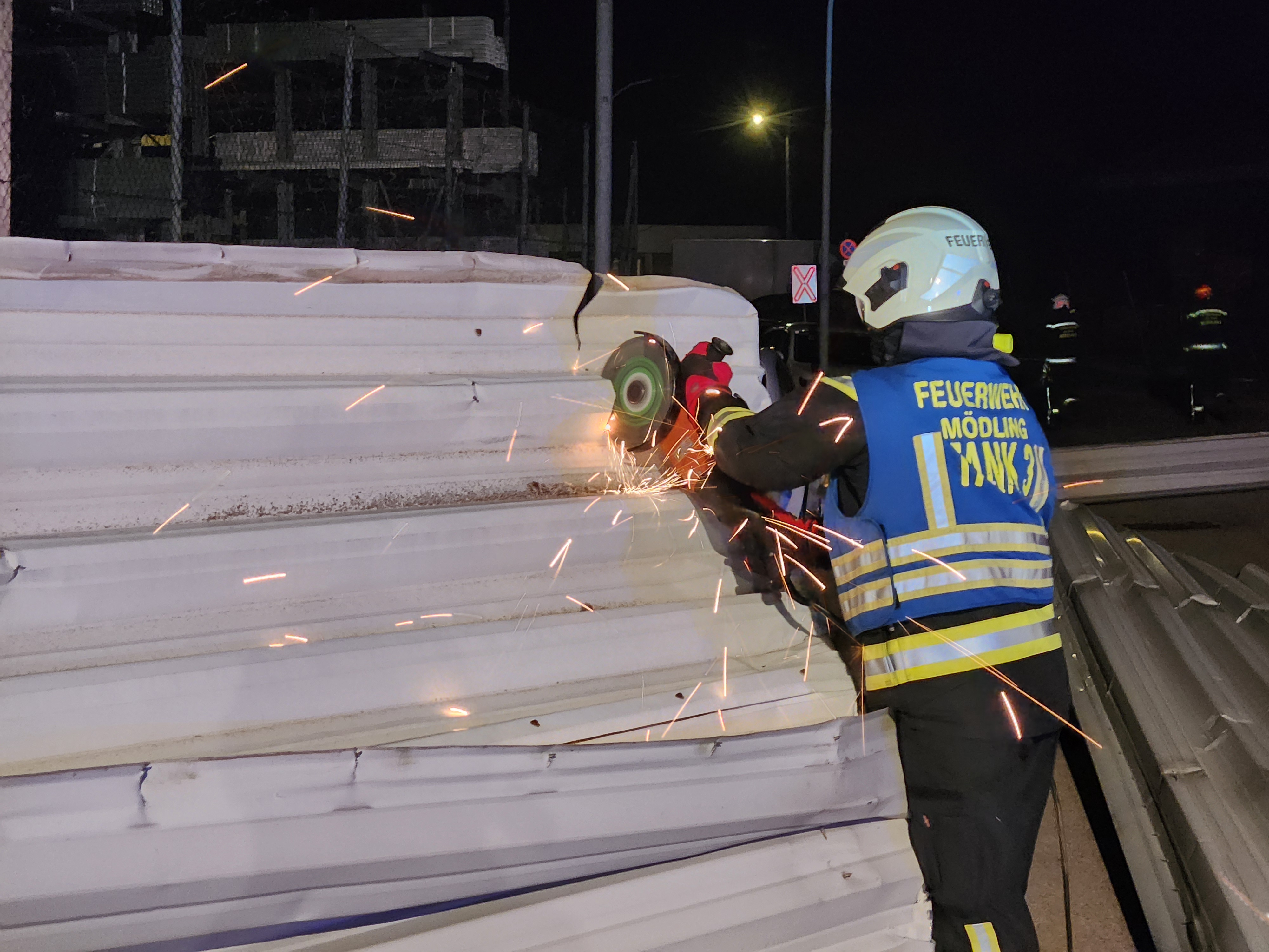 Bei einem Gewerbebetrieb in der Friedrich Schillerstraße wurden mehrere hunderte Quadratmeter Blechdach einer Lagerhalle abgedeckt und stürzten auf eine Gemeindestraße. Die Dachteile beschädigten dabei mehrere parkende Autos sowie eine Straßenlaterne. Verletzt wurde Glücklicherweise niemand. Nach Sicherung weiterer loser Blechteile am Dach folgten die Aufräumarbeiten am Boden. Teile des Daches mussten vorerst mit einem Trennschleifer zerteilt werden, ehe das Dach von den darunter liegenden Autos gehoben werden konnte. In Zusammenarbeit mit dem Bereitschafts-Elektriker wurde die Straßenlaterne demontiert. Die betroffene Straße wurde aufgrund der Gefährdung für den Verkehr gesperrt. Dieser Einsatz alleine dauerte über drei Stunden an.