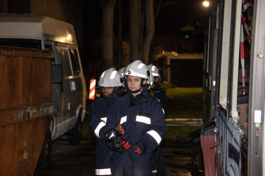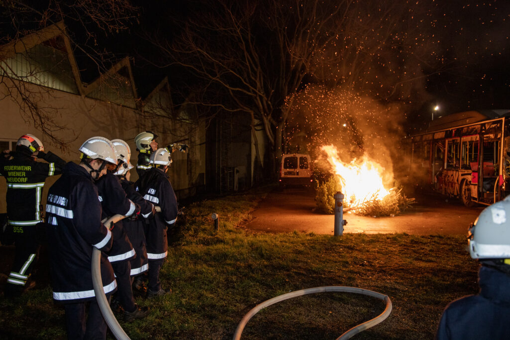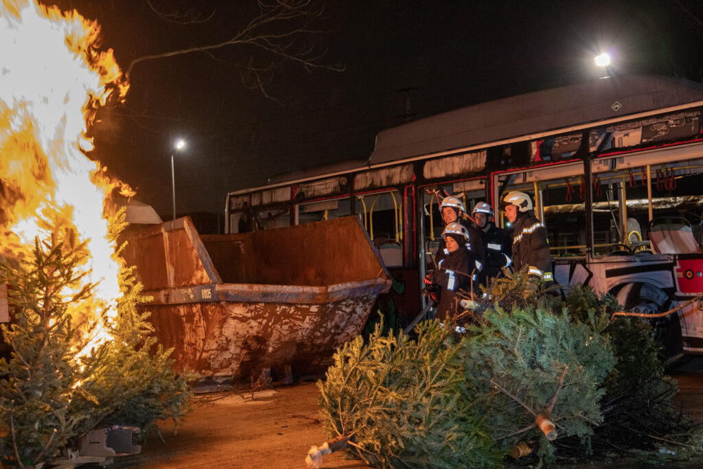 Als Szenario galt es, jeweils in Kleingruppen, in Brand stehende Weihnachtsbäume zu löschen. Der Fokus lag dabei insbesondere, die Strahlrohrführung sowie den Aufbau einer Angriffsleitung zu beüben.