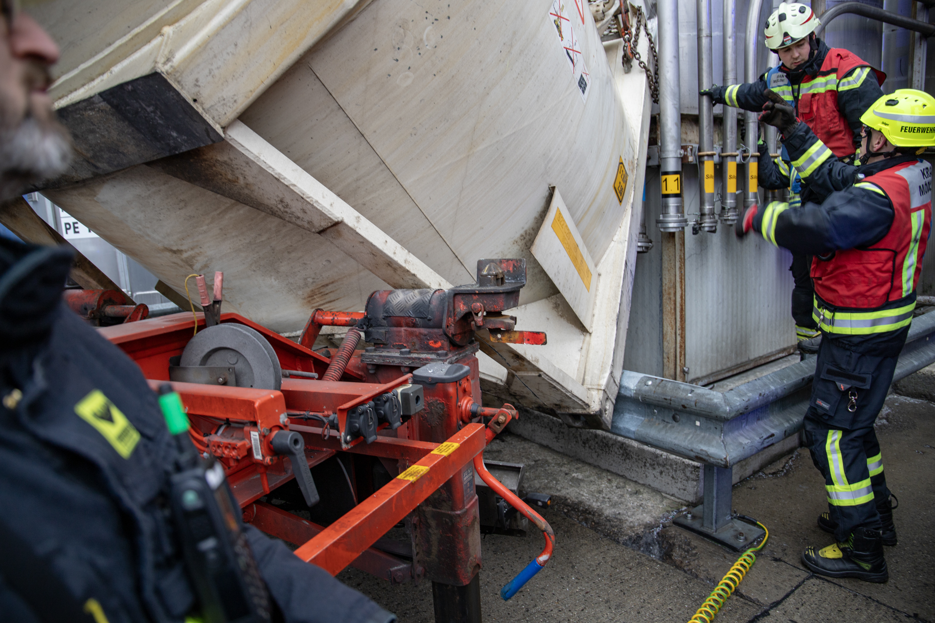 Aufgrund einer nicht ordnungsgemäßen Fixierung löste sich der Silo beim Entleeren vom Sattelschlepper-Auflieger, kollidierte mit dem Firmengebäude und brachte den Hydraulikzylinder samt Aufhängung in eine kritische Schieflage. Vor Ort befand sich zu diesem Zeitpunkt noch ein weiteres Silofahrzeug im Entladevorgang.