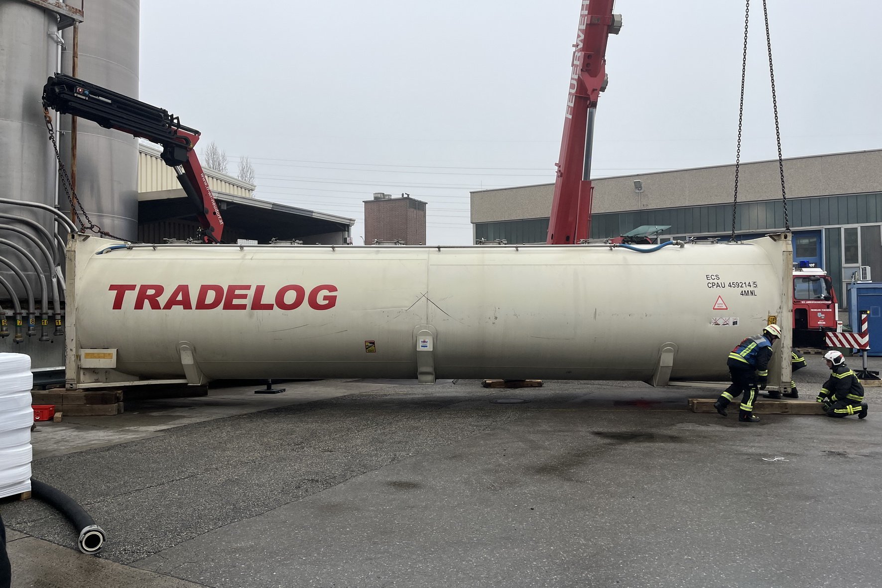 Durch den kombinierten Einsatz zweier Ladekräne sowie des Kranfahrzeugs konnte der Silo bis kurz nach 14:00 Uhr kontrolliert abgelassen und wieder auf den Sattelauflieger verladen werden. Auch gelang es im Zuge der Arbeiten an die 10 Tonnen Kunststoffgranulat den Produktionsprozess zuzufügen.