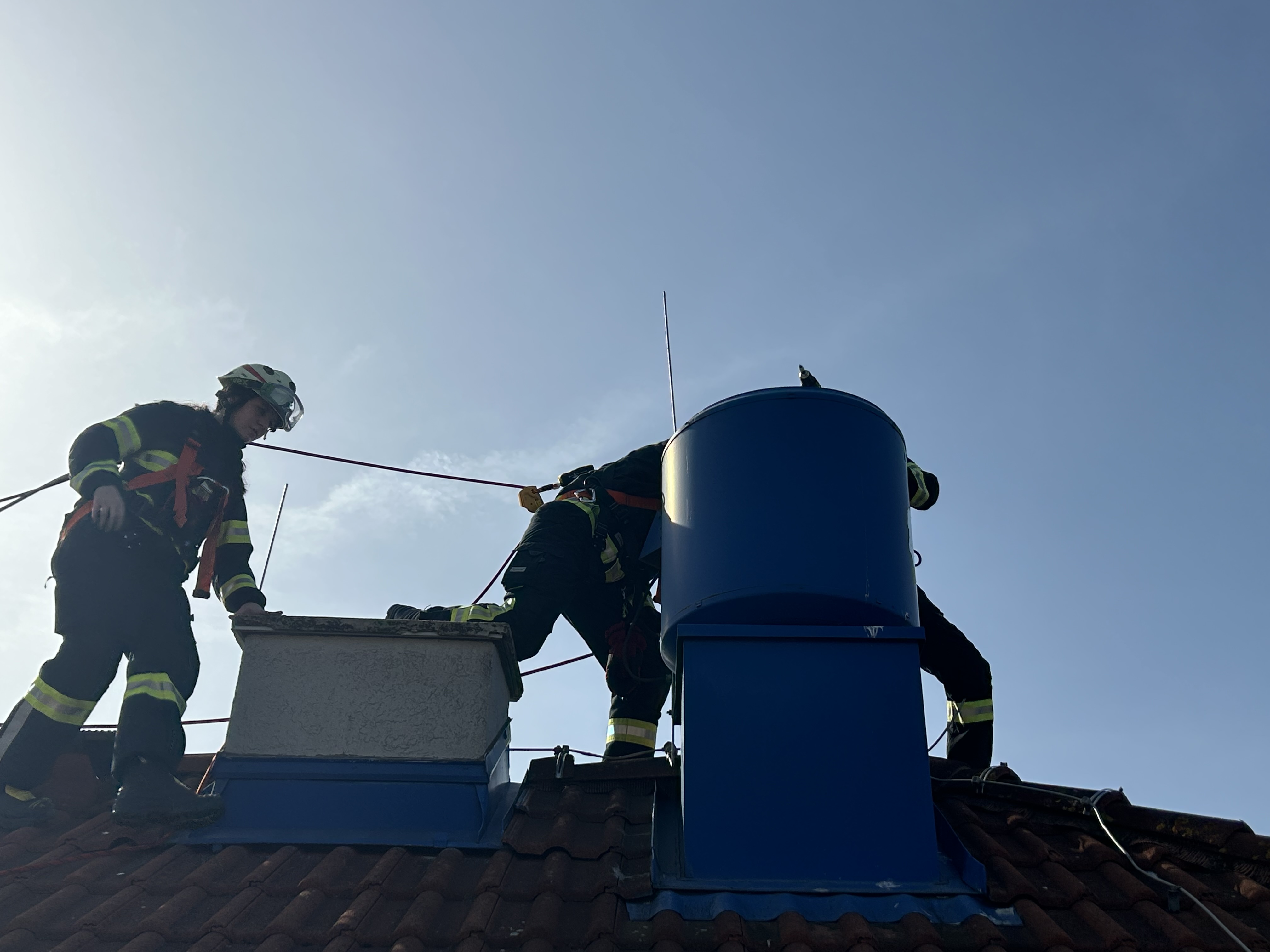 Die Feuerwehr stieg gesichert zum Gefäß auf und konnte durch lösen mehrerer Schrauben und damit Demontage eines Blechteils den Vogel befreien und anschließend wieder in die Freiheit entlassen.