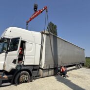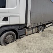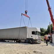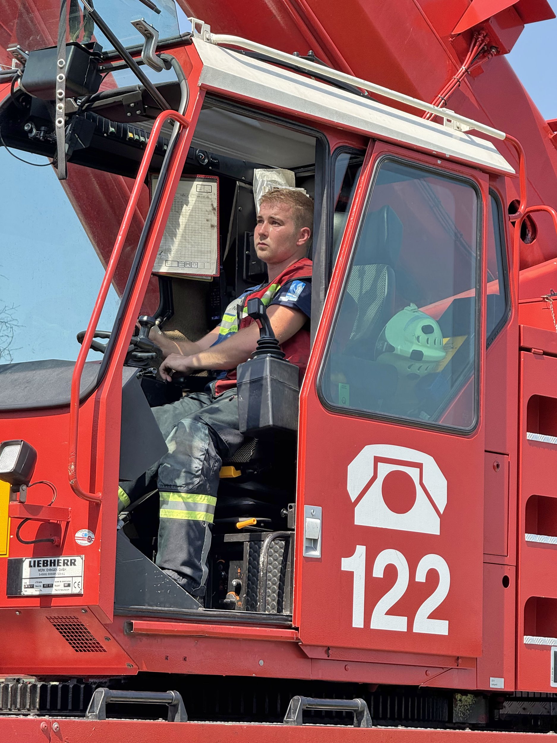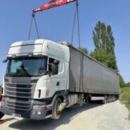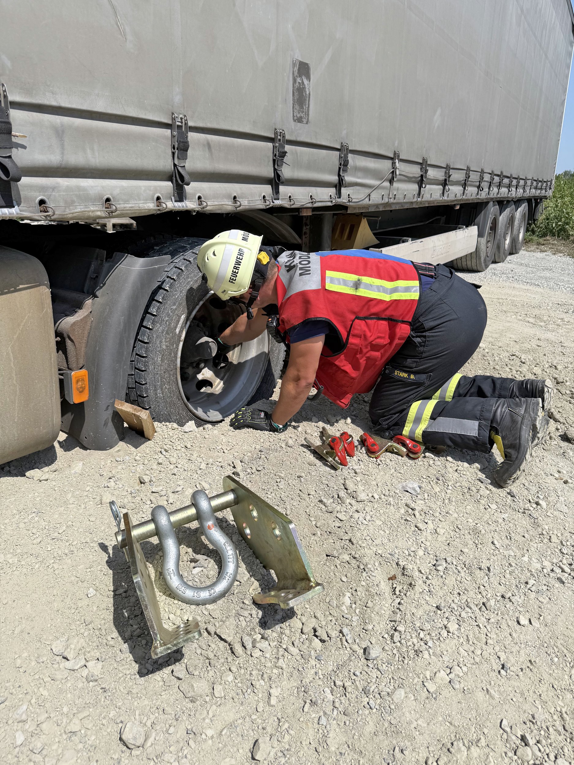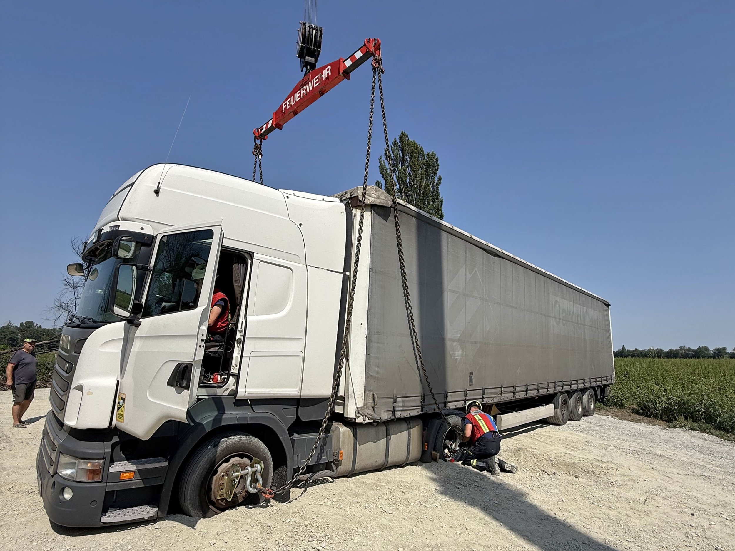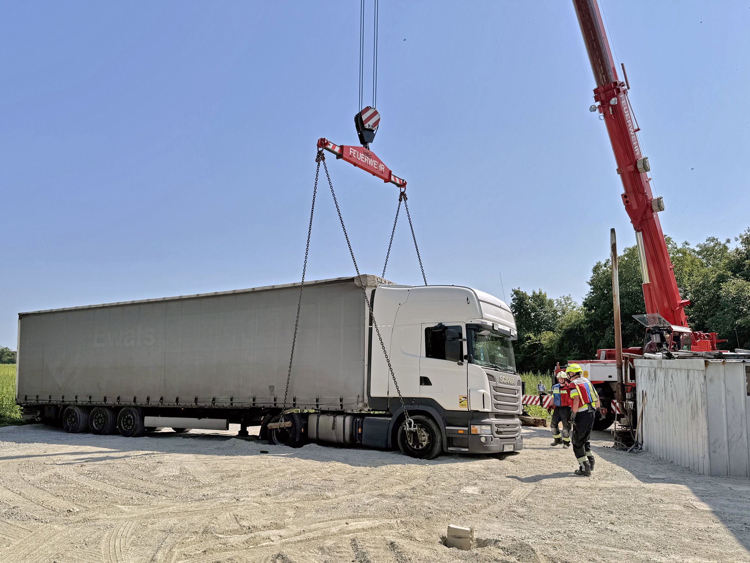 Rasch konnte der Sattelzug nach Anbringen spezieller Anschlagmittel mit einem kontrollierten Hub des Krans auf festen Boden gehoben werden.