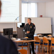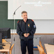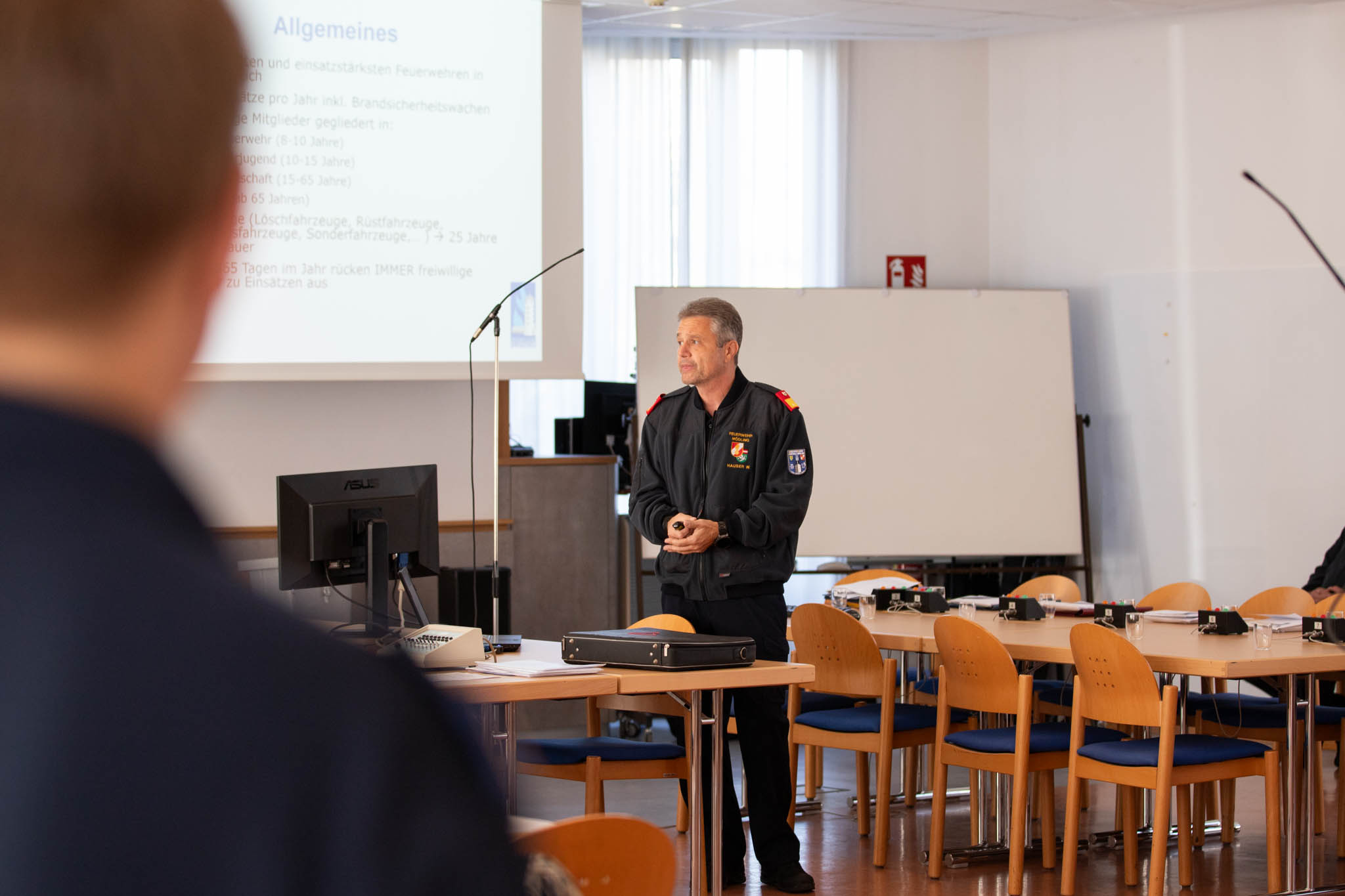 Nach kurzen Grußworten des Feuerwehrkommandanten Dipl. Ing. (FH) Werner Hauser folgte eine umfangreiche Vorstellung der Feuerwehr. Dabei wurde neben den gesetzlich verankerten Aufgaben auf den Einsatzablauf und die Infrastruktur eingegangen. Insbesondere der Umstand, dass alle Einsätze neben den Aufgaben des Dienstbetriebes durch ehrenamtliches Personal geleistet werden wurde eindrucksvoll aufgezeigt. In zwei Videos konnte die Schlagkräftigkeit zusätzlich unterstrichen werden.