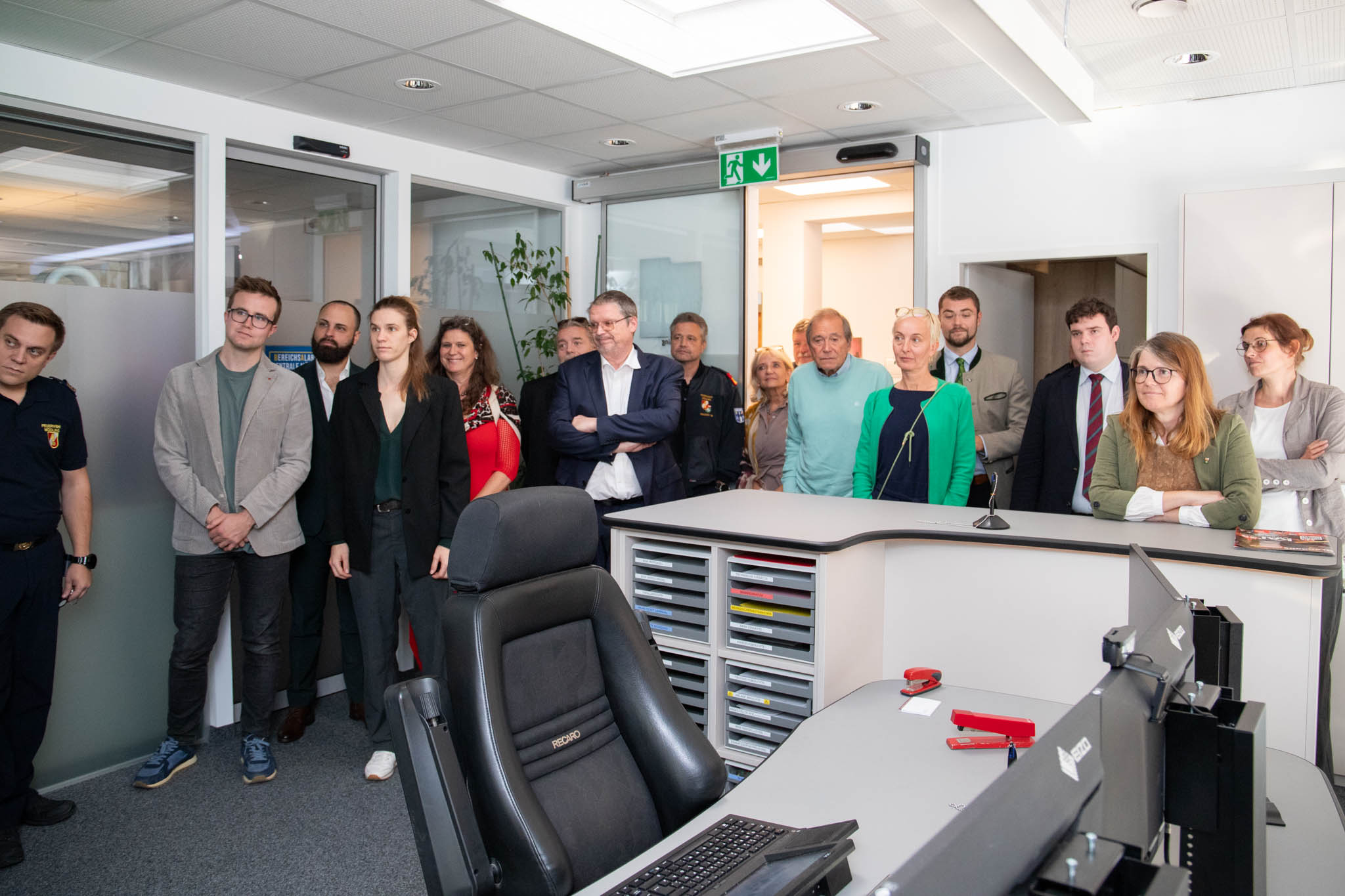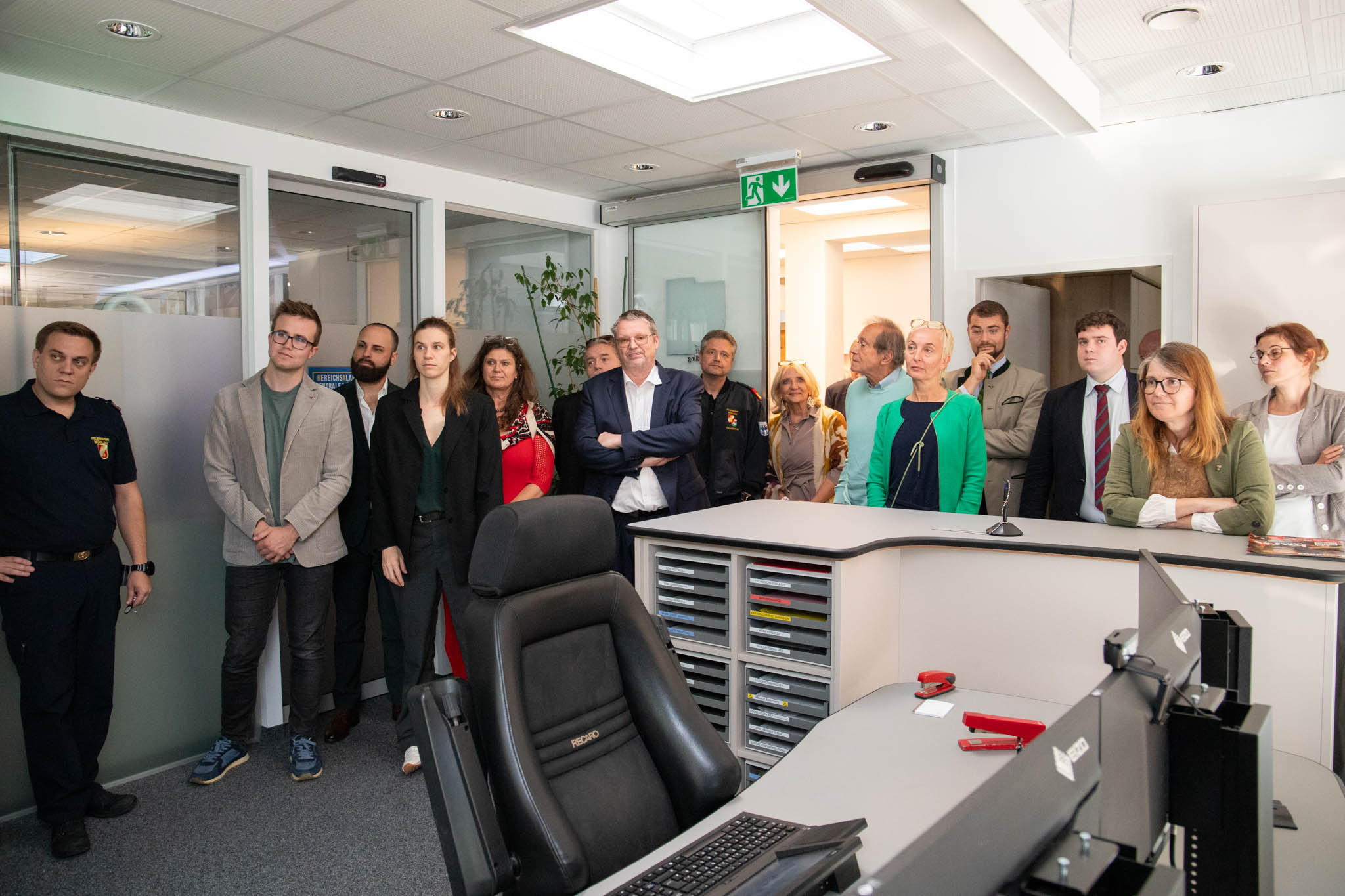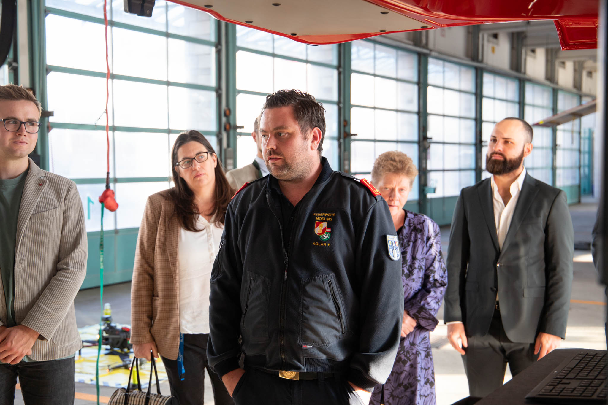 Im Anschluss folgte eine Führung durch das Feuerwehrhaus. Neben der Besichtigung der neuen Bereichsalarmzentrale wurde der umfassende Fuhrpark vorgestellt. Im Rahmen der Besichtigung bekamen die Gemeinderäte die Gelegenheit am Rande einen echten Einsatz mitzuerleben. Während bei der Besichtigung der Bereichsalarmzentrale ein Notruf über einen Verkehrsunfall auf der Südautobahn einlangte, rückte die Feuerwehr Mödling während der weiteren Vorstellung zu einem Brandeinsatz aus. Dabei zeigten sich einige Besucher insbesondere von der raschen Ausrückezeit begeistert.