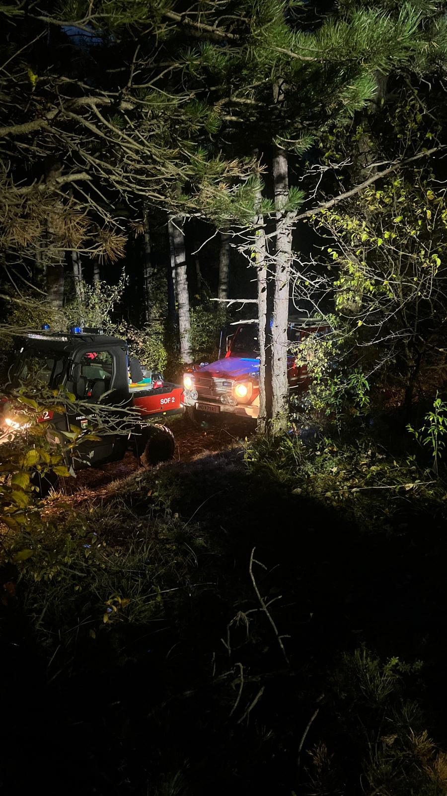 Innerhalb weniger Minuten waren zwölf Einsatzkräfte am Weg zum Berufungsort. Dieser befand sich nur wenige Meter von der ersten Einsatzstelle entfernt (Zum Bericht). Während drei geländegängige Fahrzeuge die gemeldete Brandstelle direkt anfuhren, blieb ein Tanklöschfahrzeug als Wasservorrat am Waldrand in Bereitschaft. Weiters startete die Mannschaft des Einsatzleitfahrzeugs die Drohne zur Übermittlung von Wärmebild- und Kamerabild an den Einsatzleiter. Eine Streife der Polizei erreichte Brandherd vor der Feuerwehr und konnte das Lagerfeuer mit einem Feuerlöscher bereits größtenteils ablöschen. Die Feuerwehr führte noch Nachlöscharbeiten und eine abschließende Kontrolle durch.