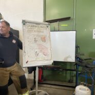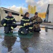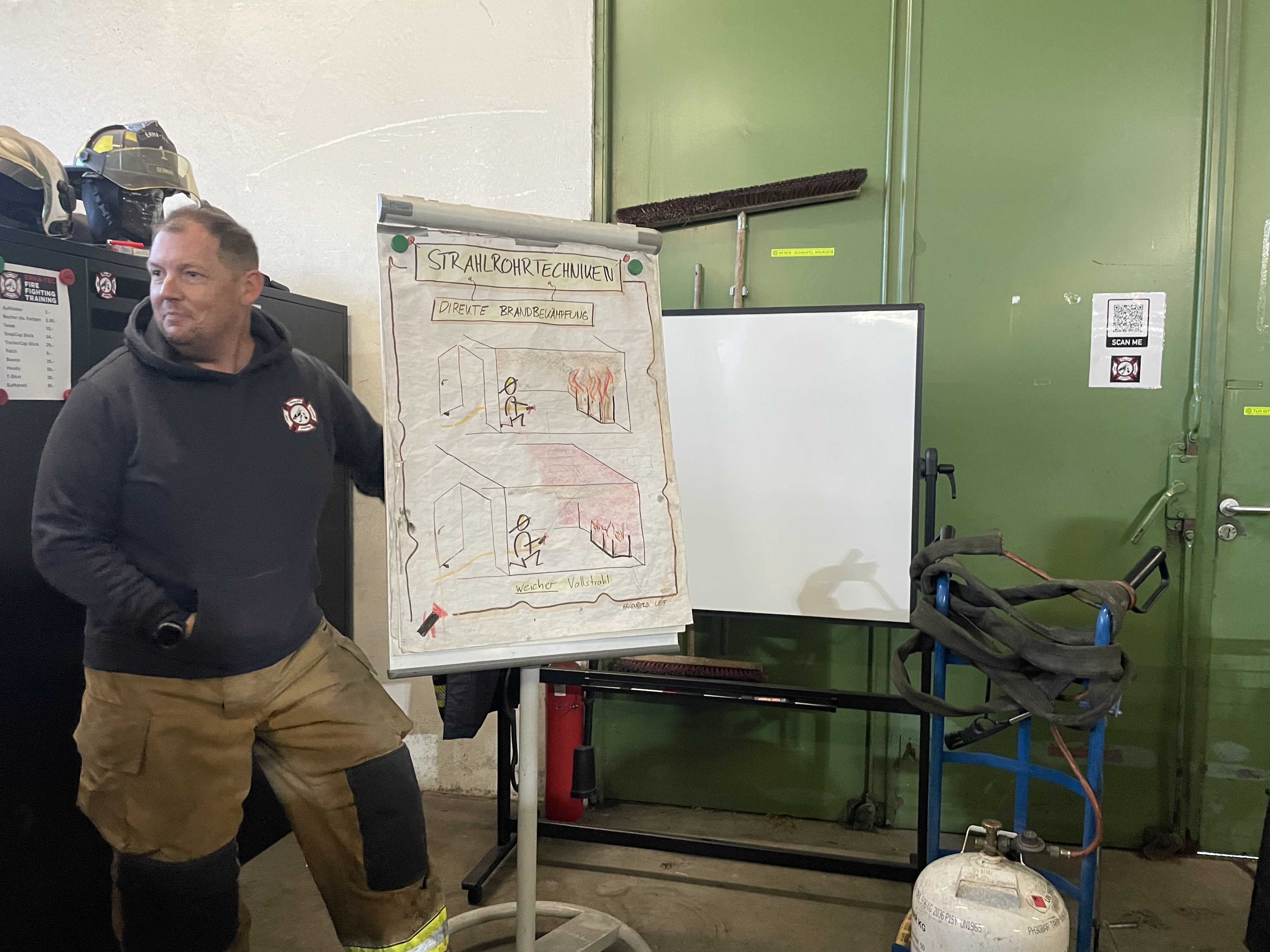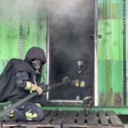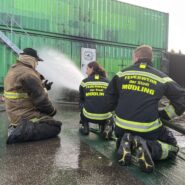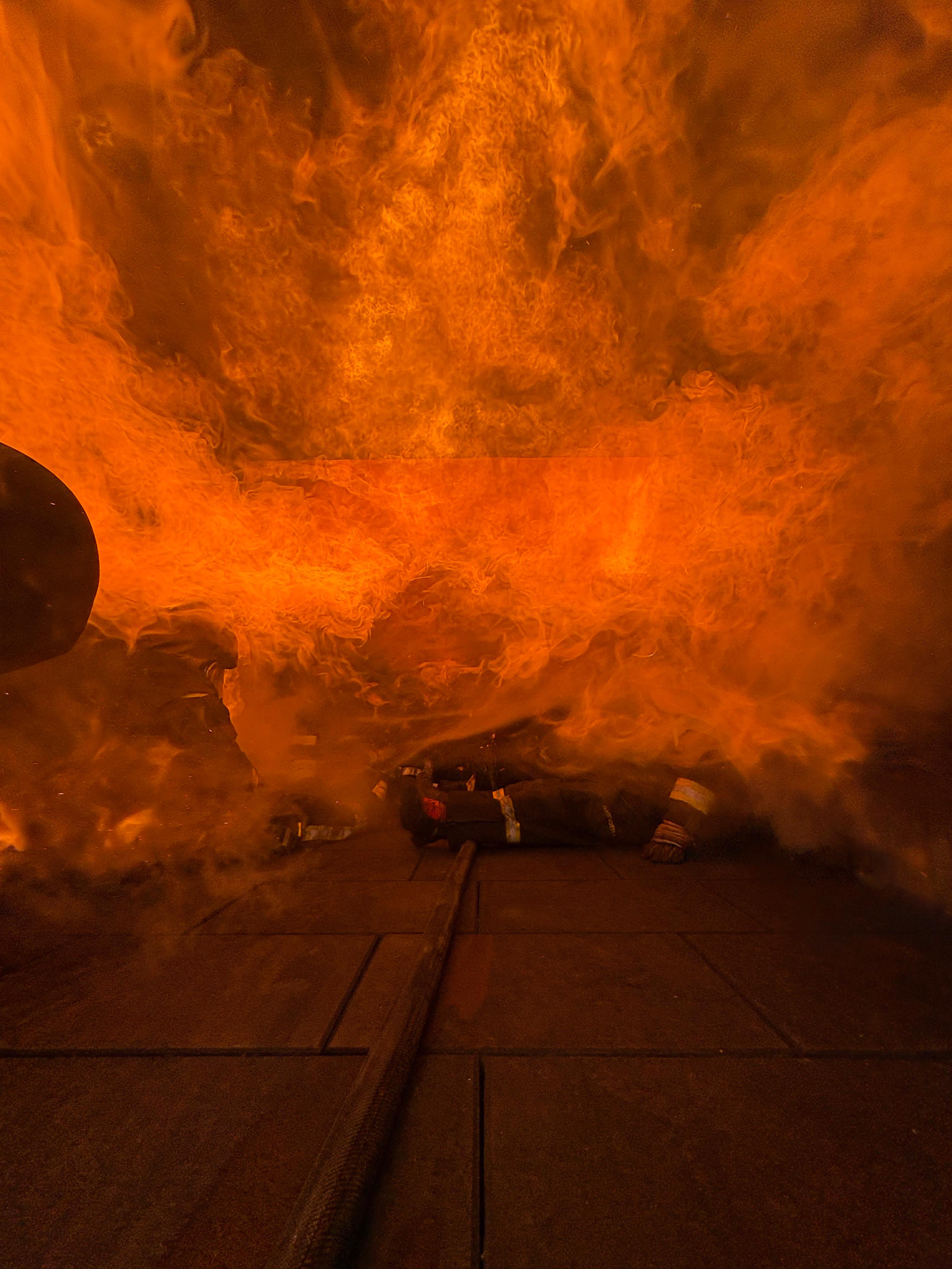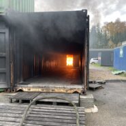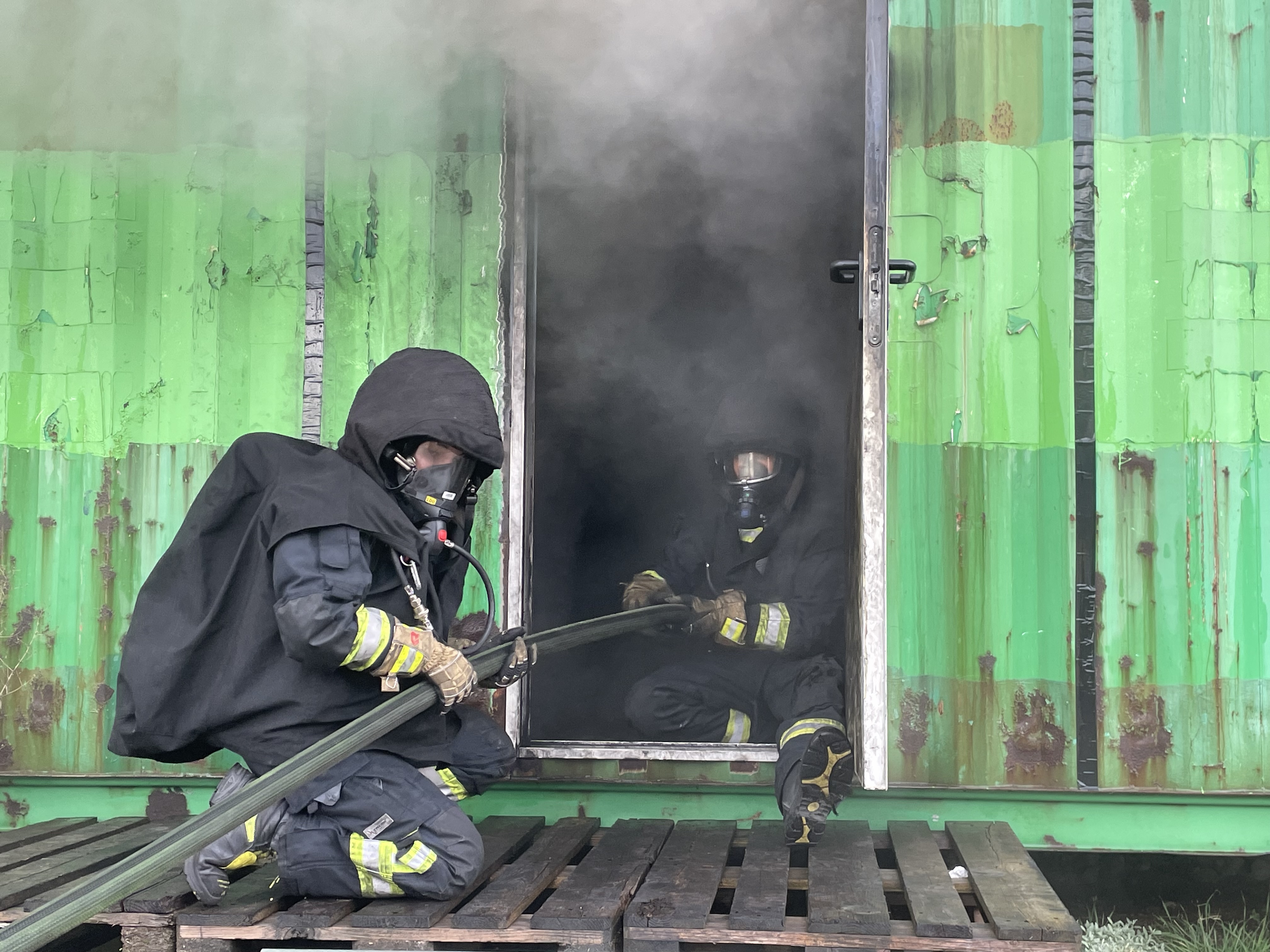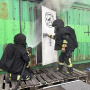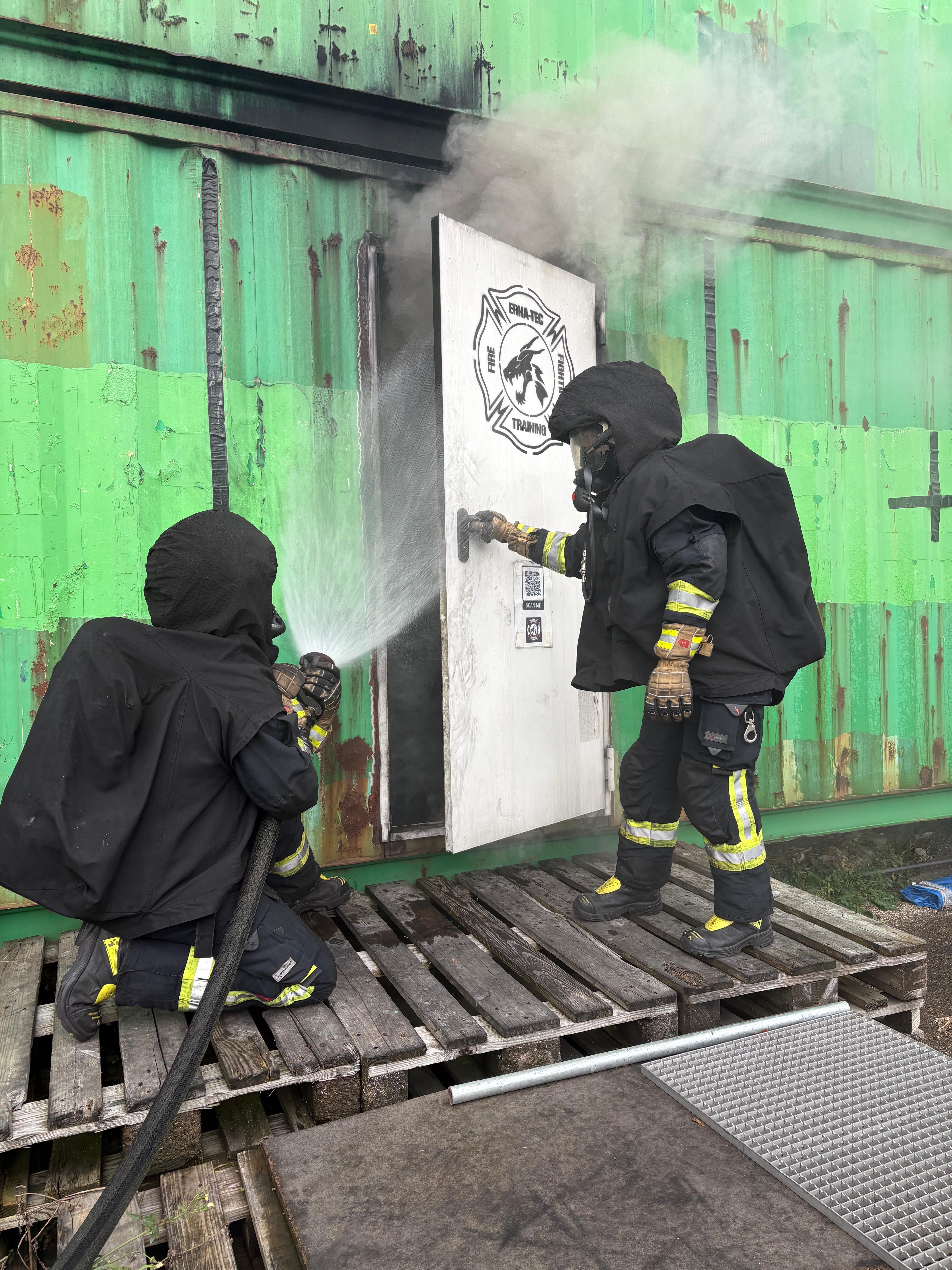 An Tag zwei folgten zunächst wieder mehrere Durchgänge in der Hitzgewöhungsanlage, wobei hier bereits Rauchgasdurchzündungen veranschaulicht wurden. Begleitet von einem Ausbilder war es allen Teilnehmenden möglich, das Verhalten vom Entstehungsbrand bis zum Vollbrand sowie der Rauchschichten sowohl zu sehen als auch entsprechende Hitze zu verspüren. Das Strahlrohrtraining und Brandbekämpfung in der festbrennstoffbefeuerten Anlage rundeten den Vormittag ab. Nachmittags galt es selbständig im Brandcontainer zu Arbeiten. Ziel war es hier, Rauchgase vor- und nach öffnen einer Türe zum Brandraum, zu kühlen. Im Anschluss wurden die Inhalte in Form einer Übung, jeweils zu zweit im Trupp abgearbeitet.