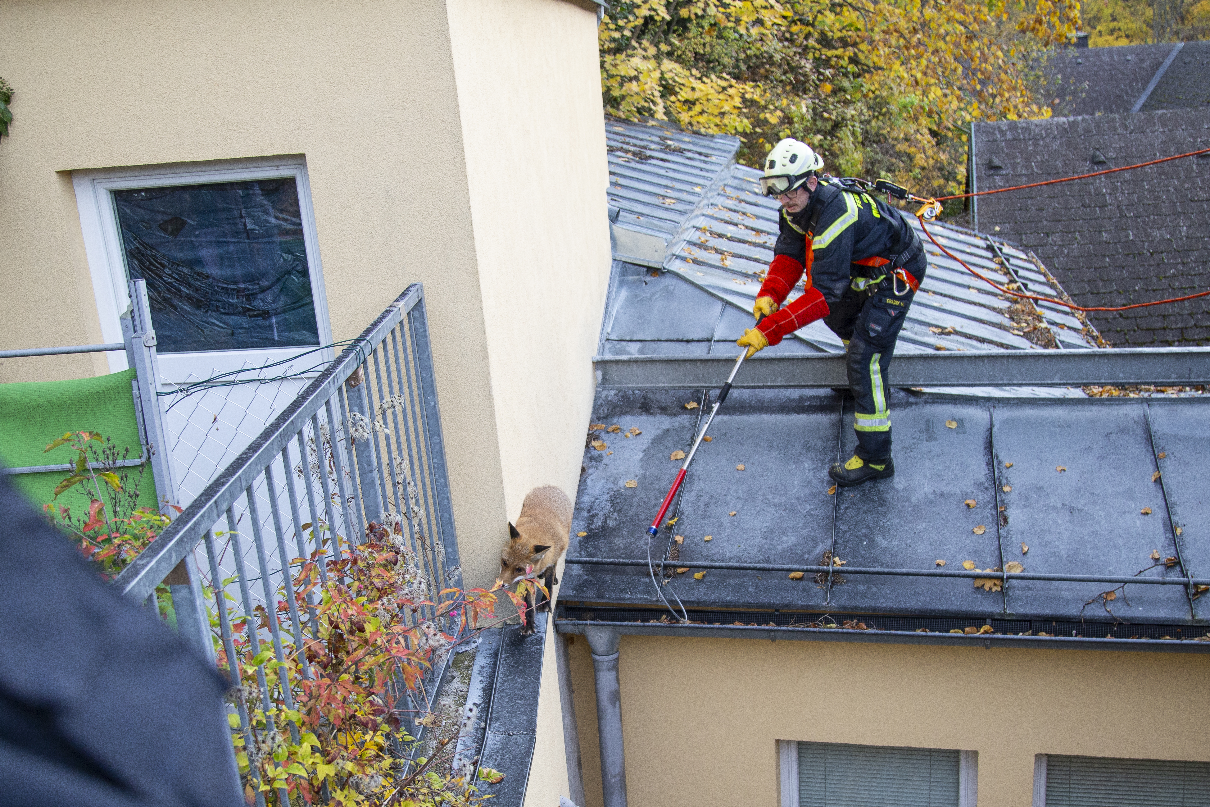 Ein Fuchs verirrte sich auf das Blechdach eines Innenhofes. Mit Hilfe der Feuerwehr konnte das Tier zurück in den Wald.