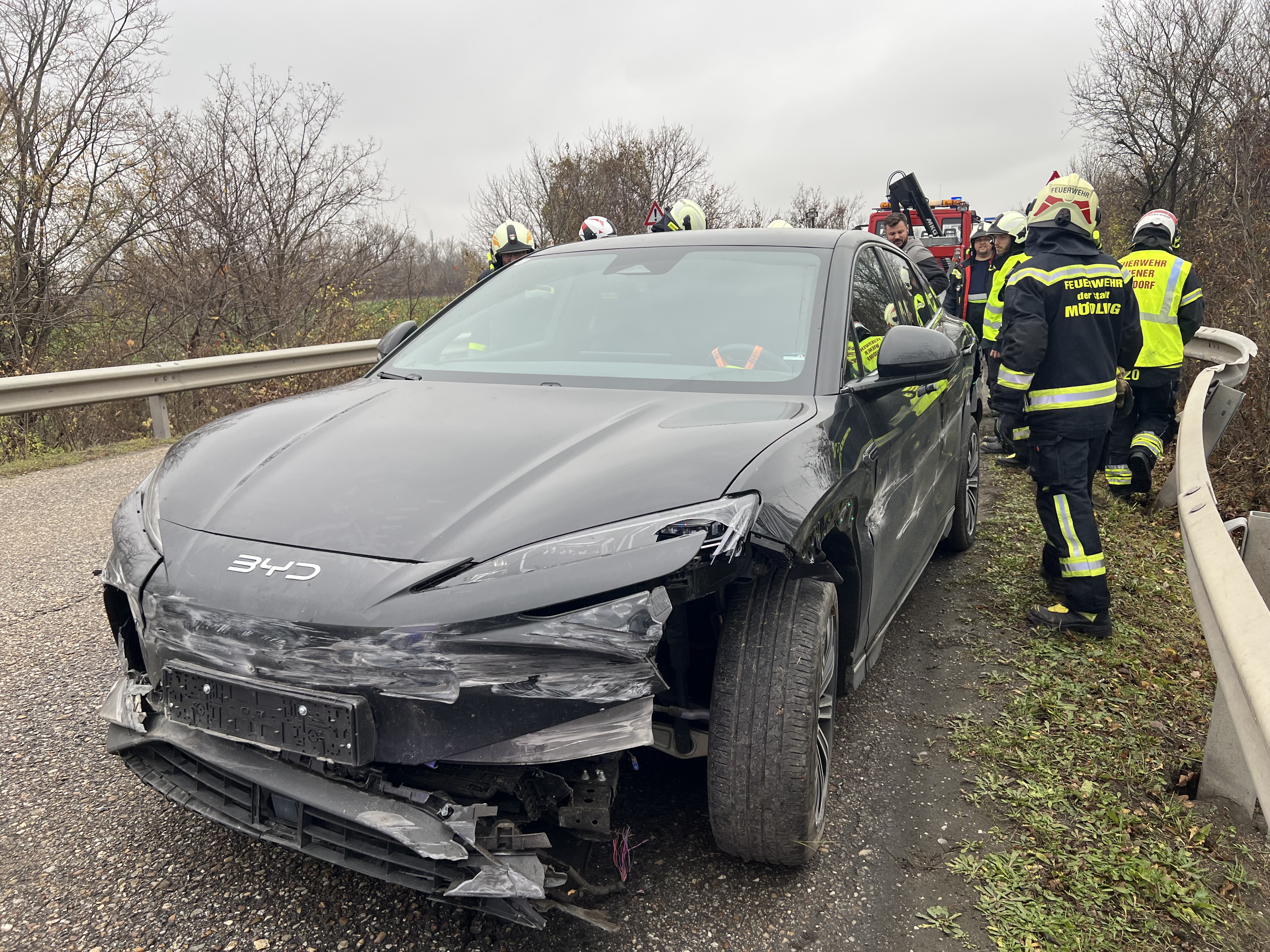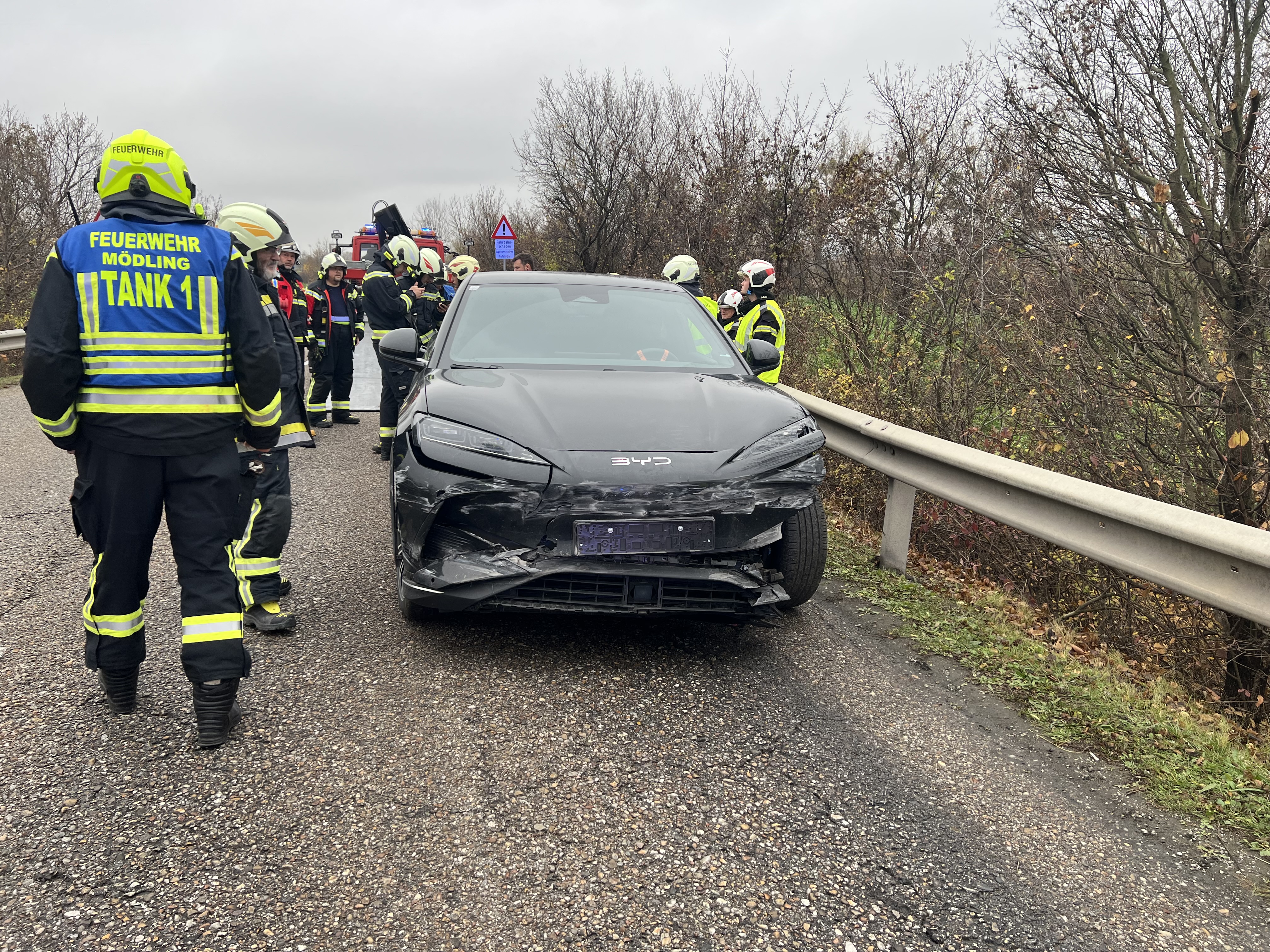 Nach einer Brandmeldeauslösung aufgrund eines mutwillig eingeschlagenen Druckknopfmelders in der Früh, wurde die Feuerwehr Mödling am Vormittag zu einem Brand eines Elektrofahrzeuges nach Wiener Neudorf alarmiert. Nach Eintreffen konnte rasch Entwarnung gegeben werden, es handelte sich lediglich um einen Verkehrsunfall - ein PKW Brand bestätigte sich nicht. Ein Elektrofahrzeug hatte mehrmals die Leitschiene touchiert und kam verkehrsbehindernd zum Stillstand. Während eine unbestimmten Grades verletzte Person durch den Rettungsdienst versorgt wurde, erfolgte die Fahrzeugbergung mit dem Abschleppfahrzeug der Feuerwehr Mödling.