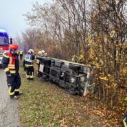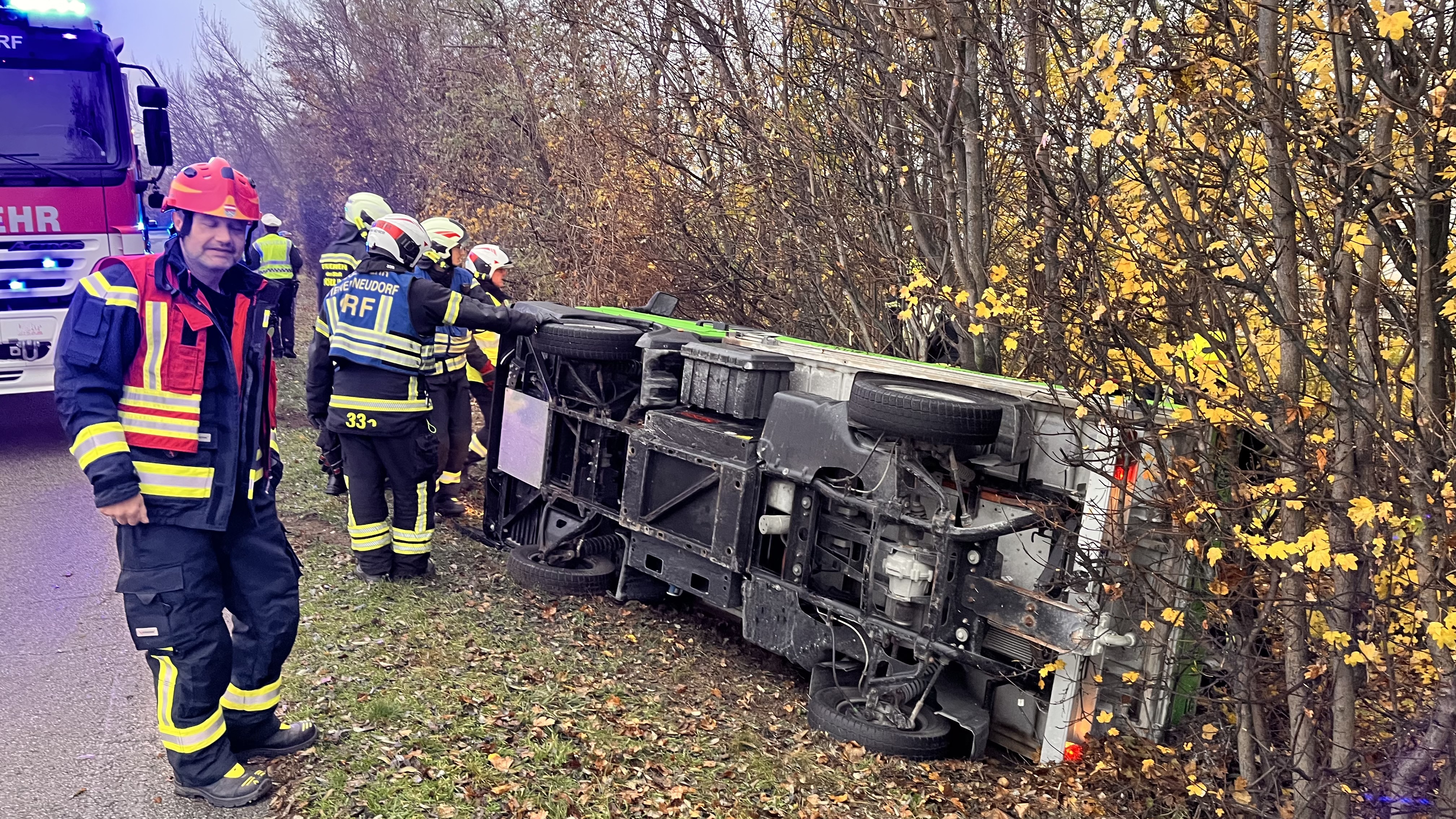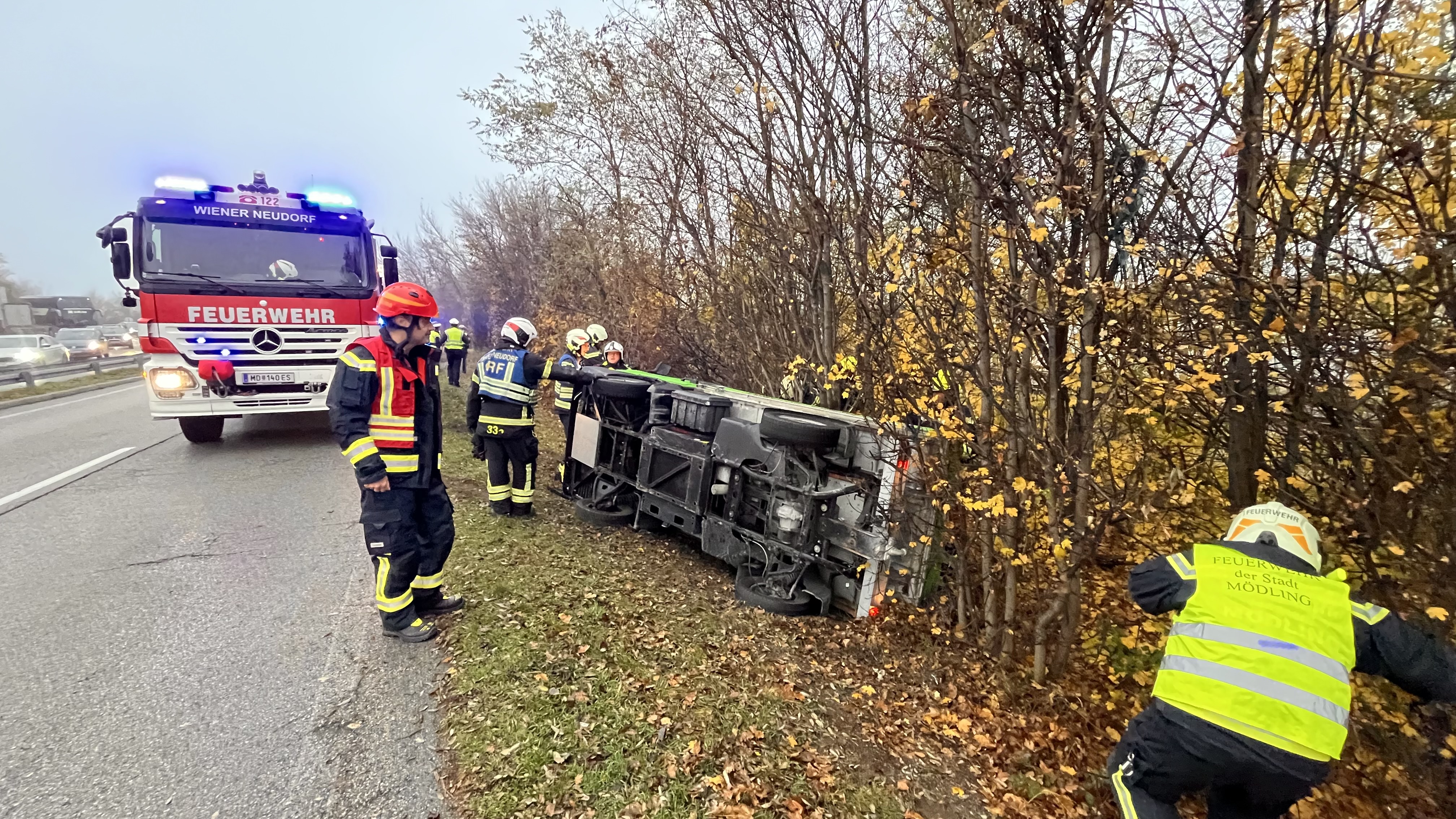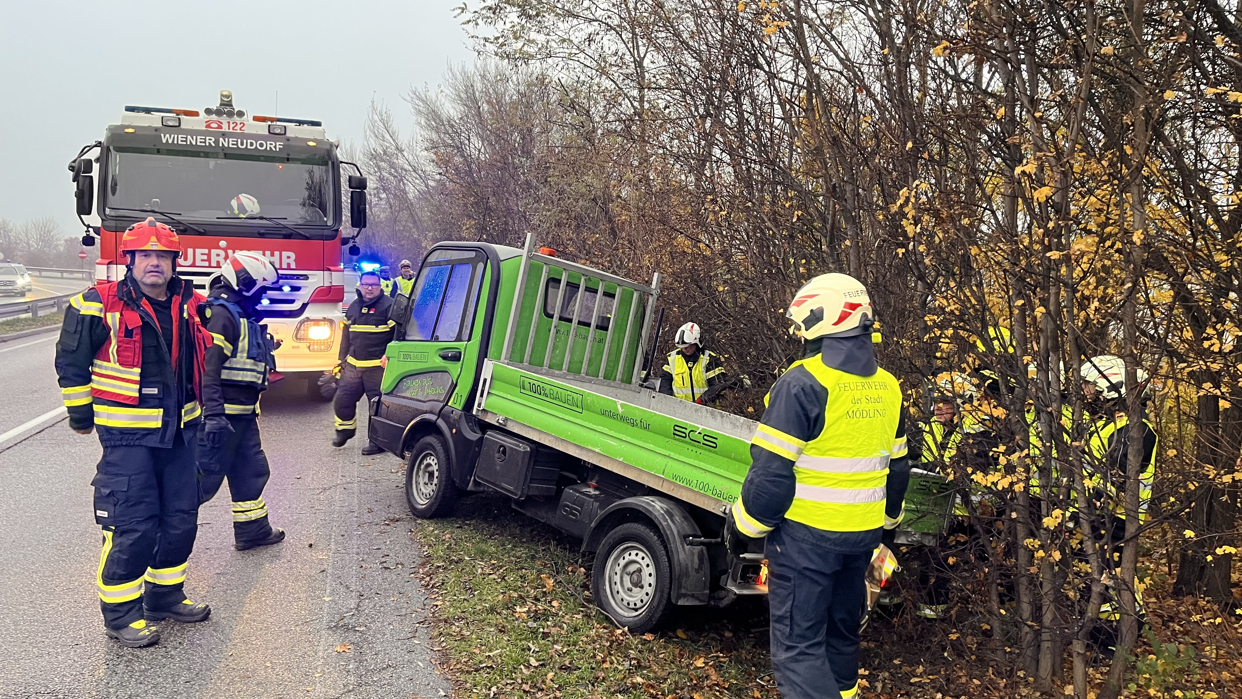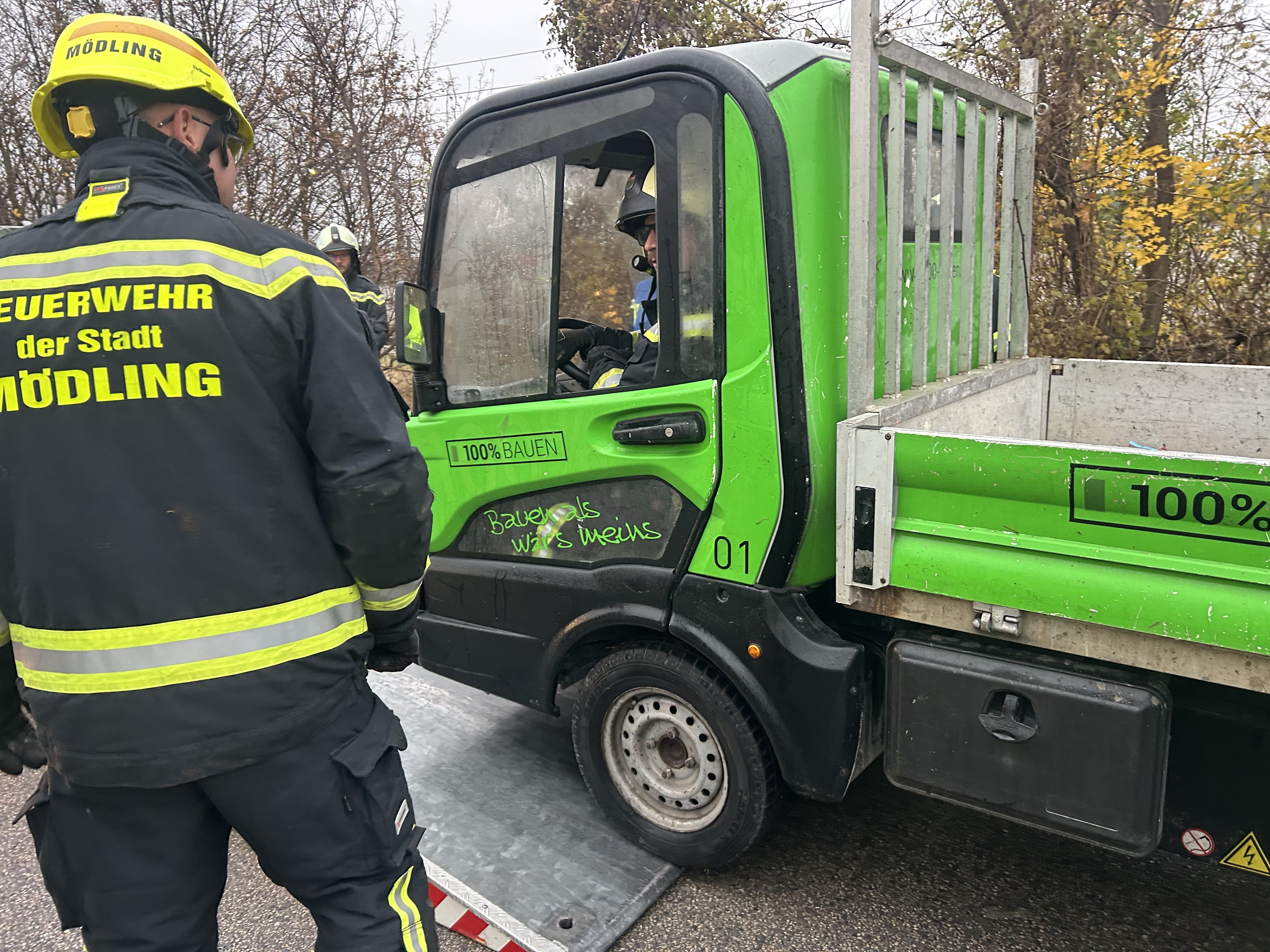 Am Nachmittag wurde die Feuerwehr Mödling zeitgleich zu zwei Einsätzen, einem Verkehrsunfall mit einem umgekippten Transportfahrzeug in Wiener Neudorf und einer Notbefreiung zweier Personen aus einem Aufzug im Stadtgebiet von Mödling alarmiert. Während zwei Fahrzeuge die Personenrettung aus dem Aufzug abarbeiteten und die Personen rasch befreien konnten, rückten vier Fahrzeuge nach Wiener Neudorf aus. In einer Kurve war dort ein Elektro-Transportfahrzeug umgekippt. Alle Personen konnten sich glücklicherweise vor Eintreffen der Feuerwehr selbstständig befreien. Die Feuerwehrkräfte aus Mödling und Wiener Neudorf konnten das umgestürzte Fahrzeug gemeinsam bergen.