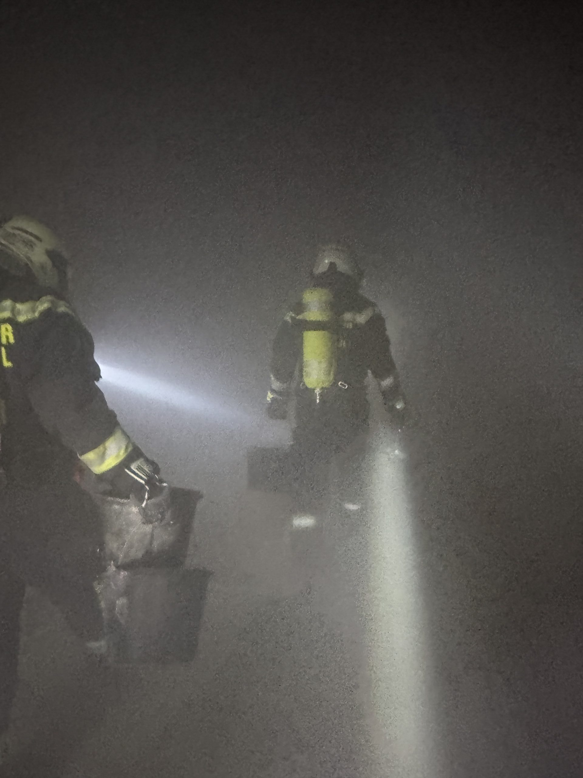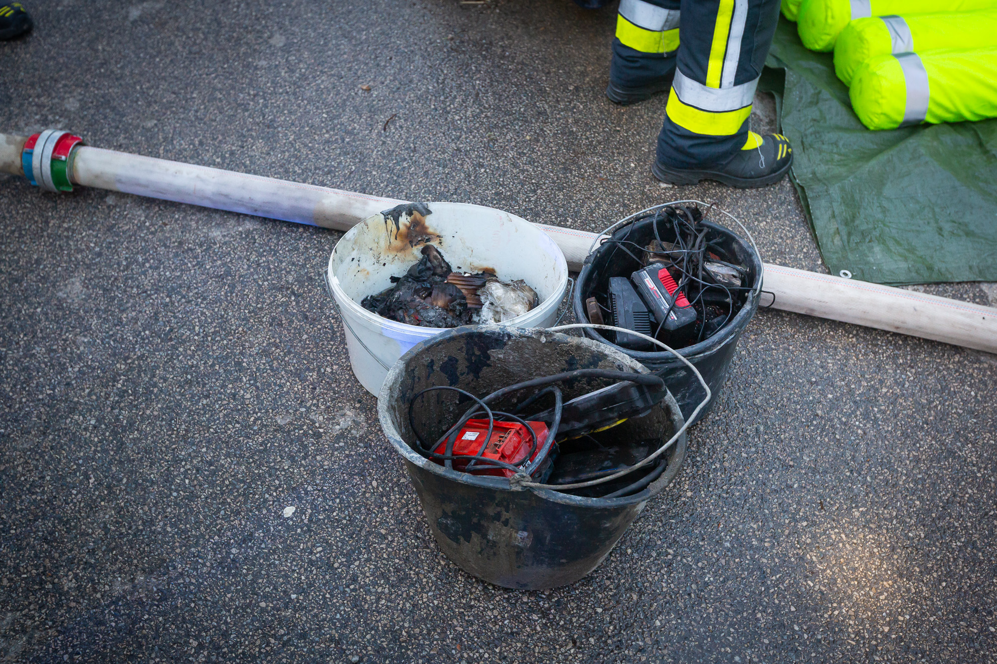 Im Inneren hatte offenbar eine größere Anzahl an Akkus, Verteilersteckdosen und in weiterer Folge auch Kartons gebrannt. Das Feuer war zu diesem Zeitpunkt jedoch bereits großteils von selbst erloschen.