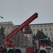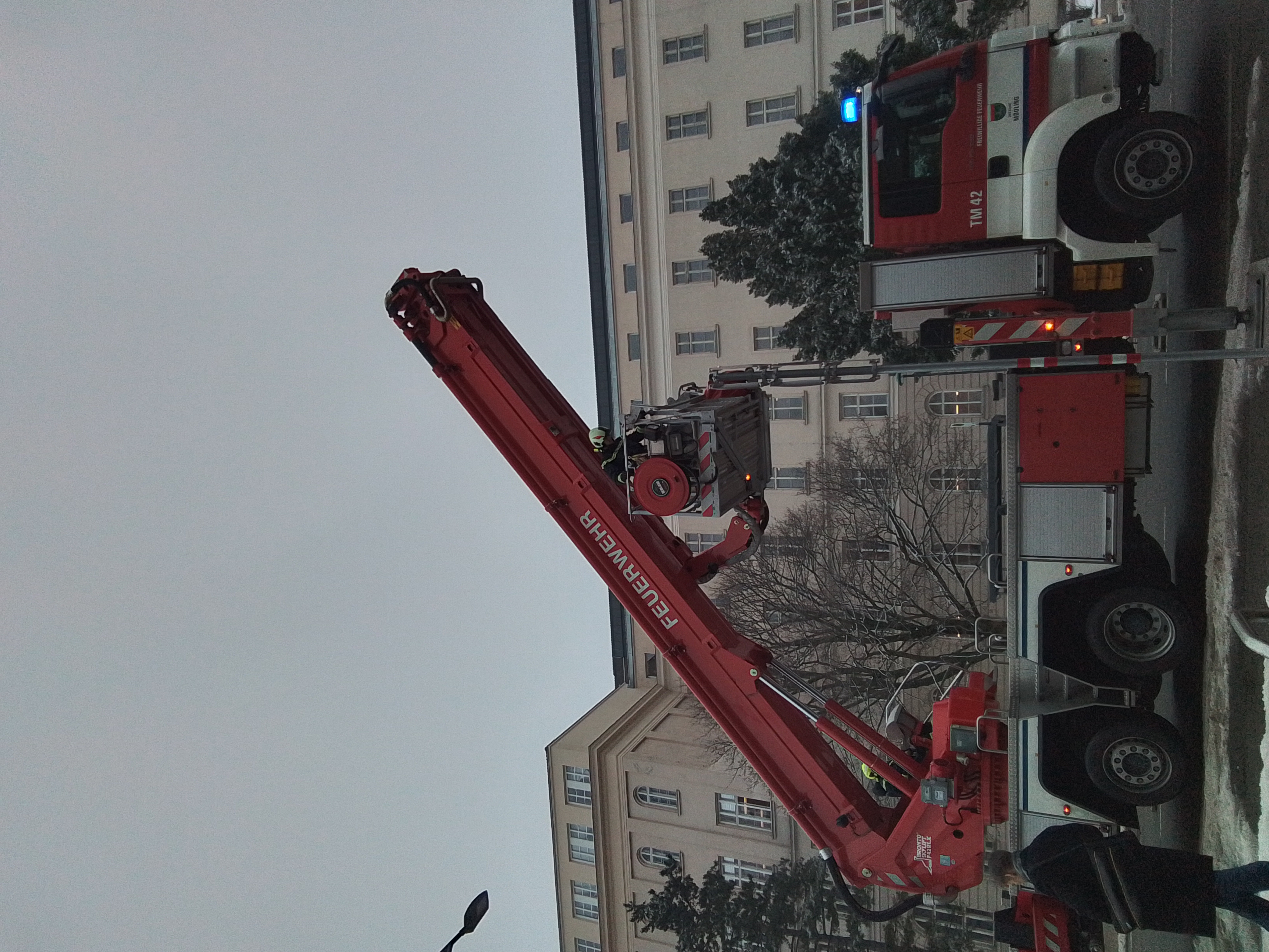 Aufgrund des momentanen Tauwetters drohten in der Technikerstraße Eisplatten von einem mehrstöckigem Wohnhaus auf einen Gehweg zu stürzen. Die Feuerwehr Mödling stand mit dem Hubrettungsfahrzeug bei Sicherungsarbeiten im Einsatz.
