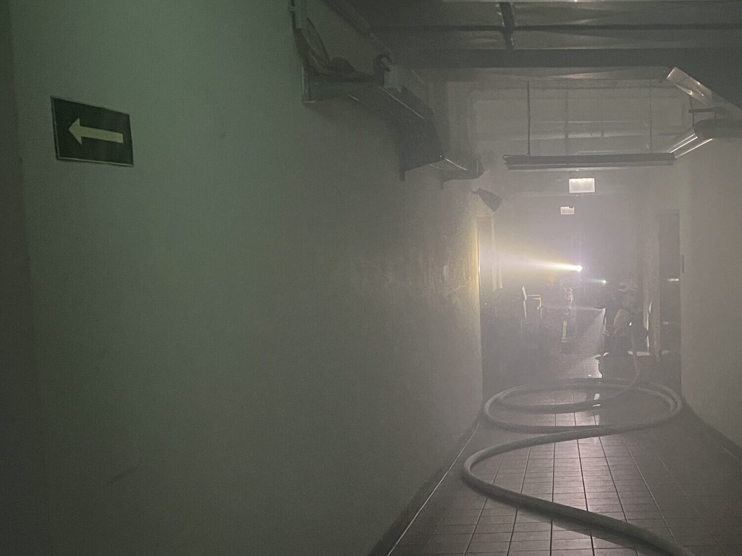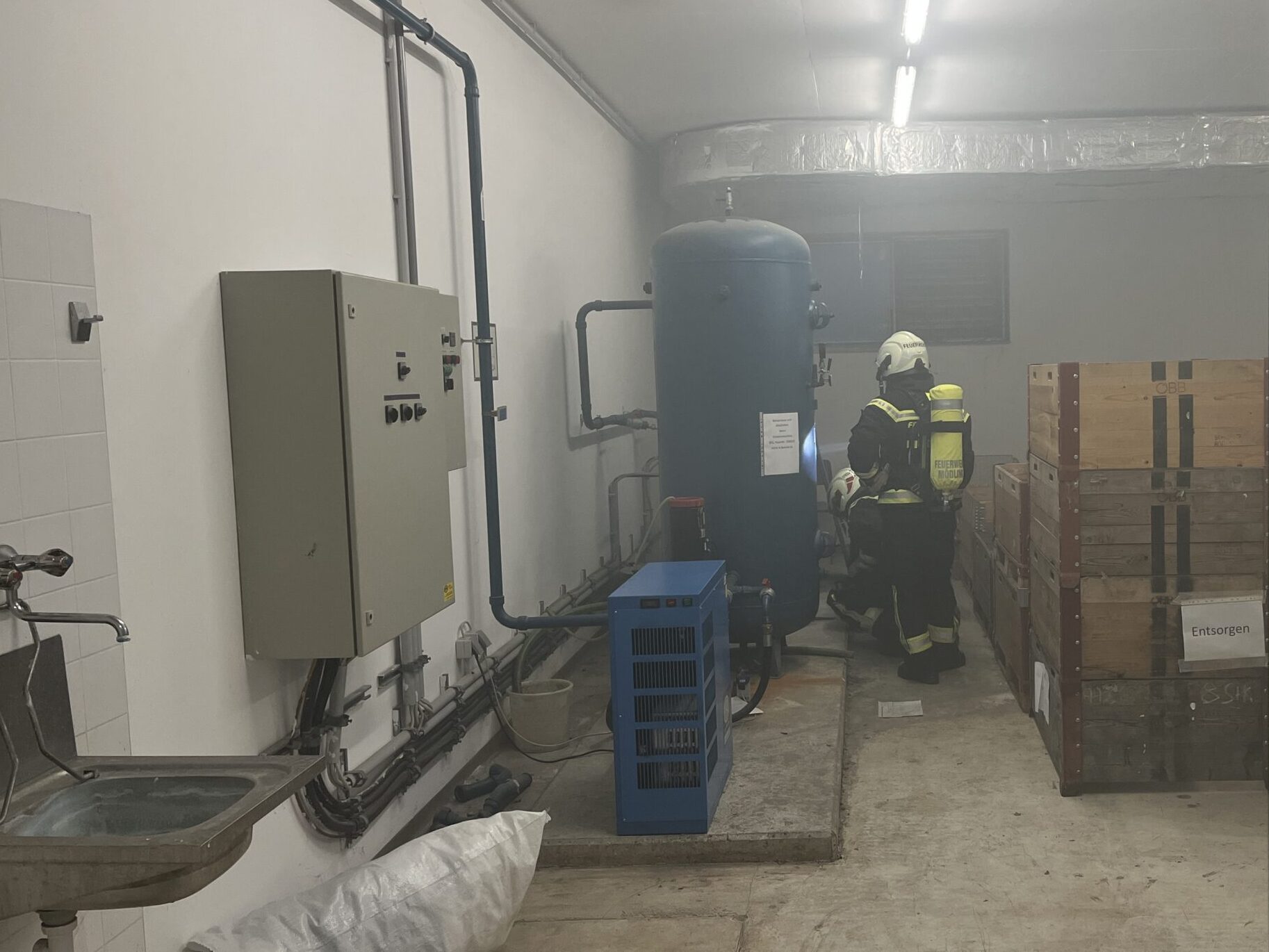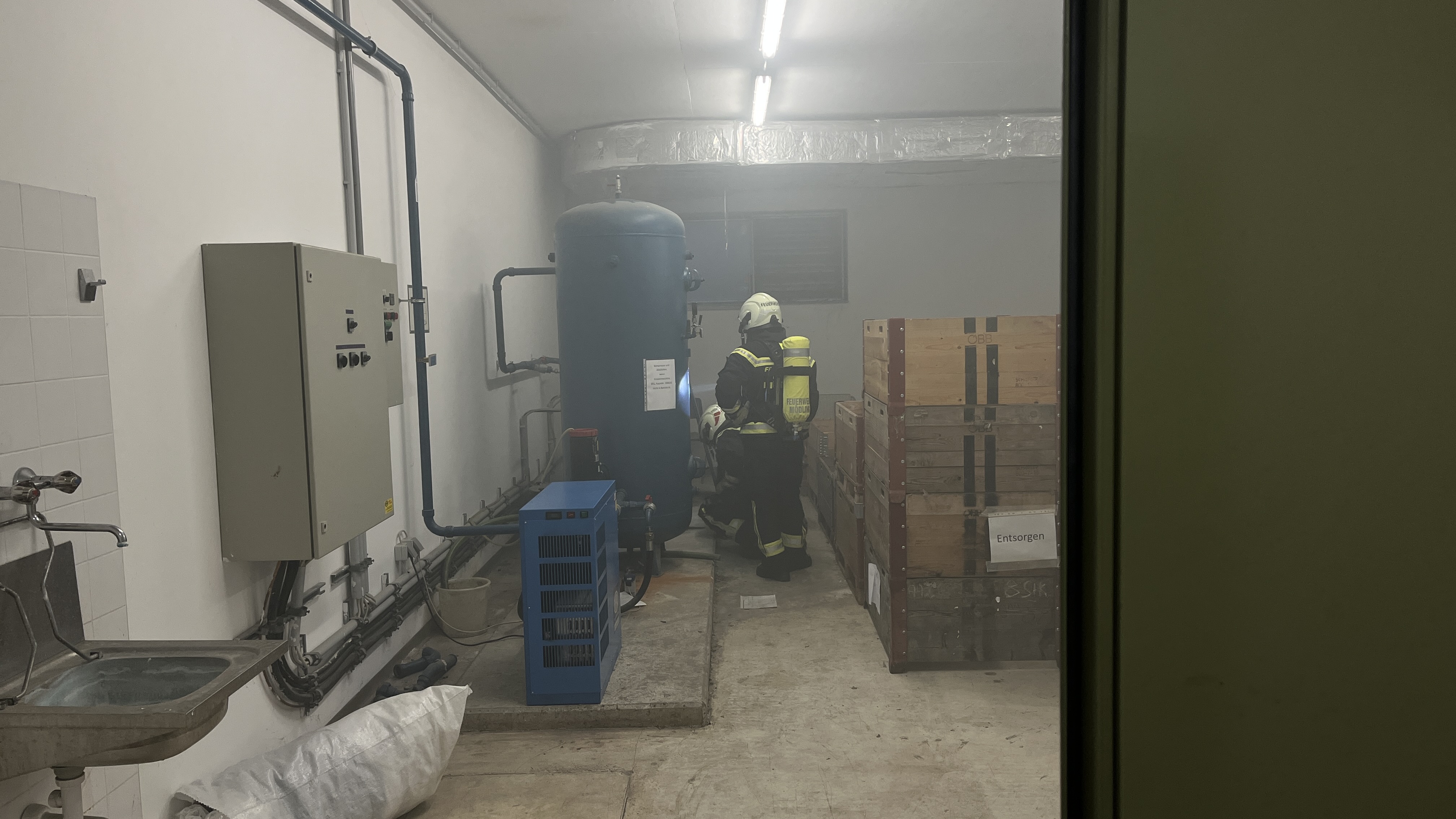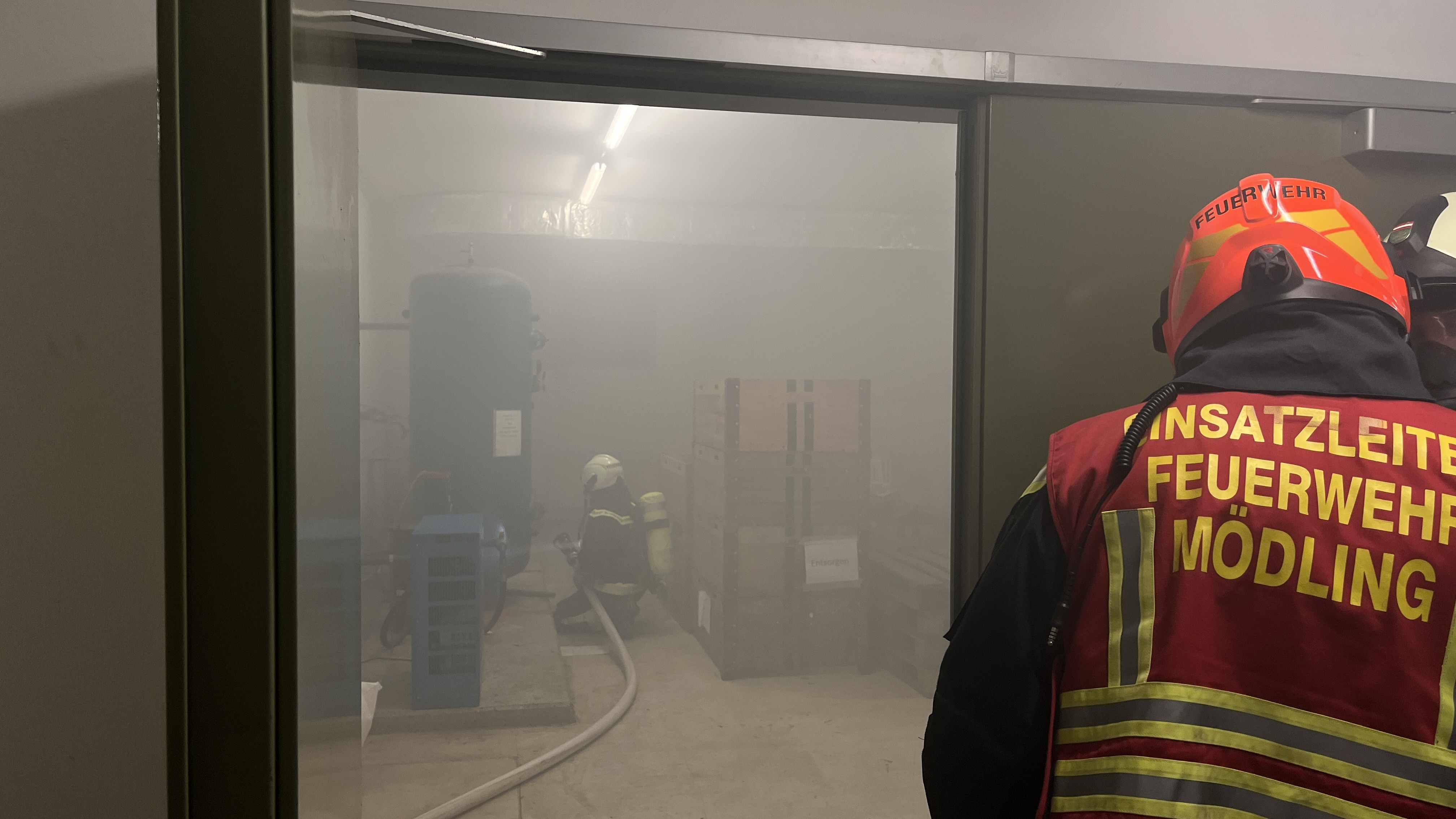 Um 15:36 Uhr ging es für Mödlings Feuerwehr vom Fahrzeugbrand direkt zum nächsten Einsatz: in einer Schule trat Rauch aus dem Keller. Die Einsatzkräfte machten sich umgehend auf den Weg und begannen mit der Erkundung des betroffenen Gebäudes. Schnell war klar, dass sich keine Personen mehr im Gebäude waren und sich die Rauchentwicklung lediglich auf den Keller beschränkte. Mit einer Löschleitung drang ein Atemschutztrupp in den verrauchten Bereich vor. Die Ursache war rasch gefunden: Ein Defekt an einem Druckluftkompressor führte zur Verdampfung von Kühlmittel oder Öl. Das betroffene Gerät wurde vom Strom getrennt, mittels Wärmebildkamera kontrolliert und der Raum anschließend ausgiebig belüftet.