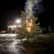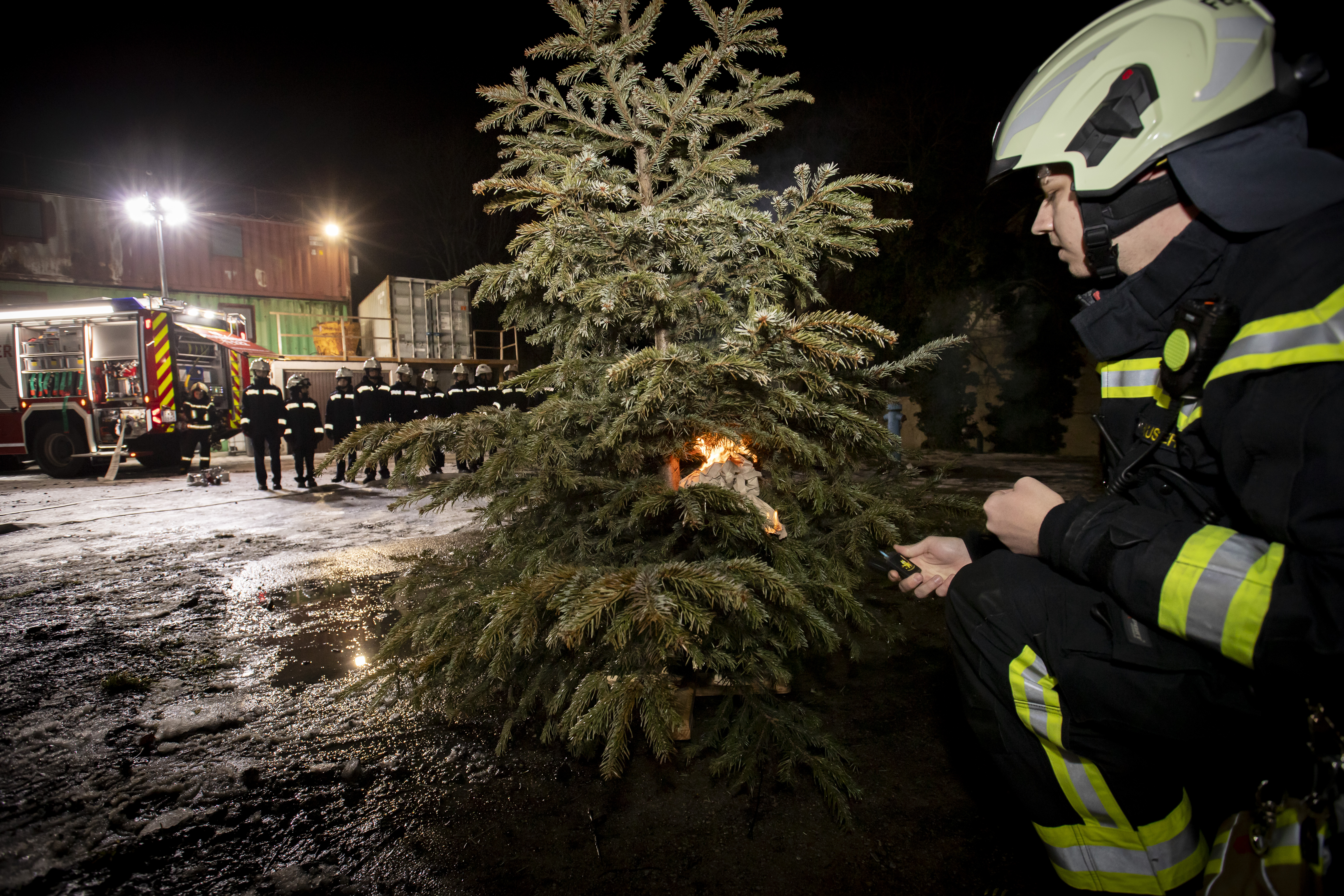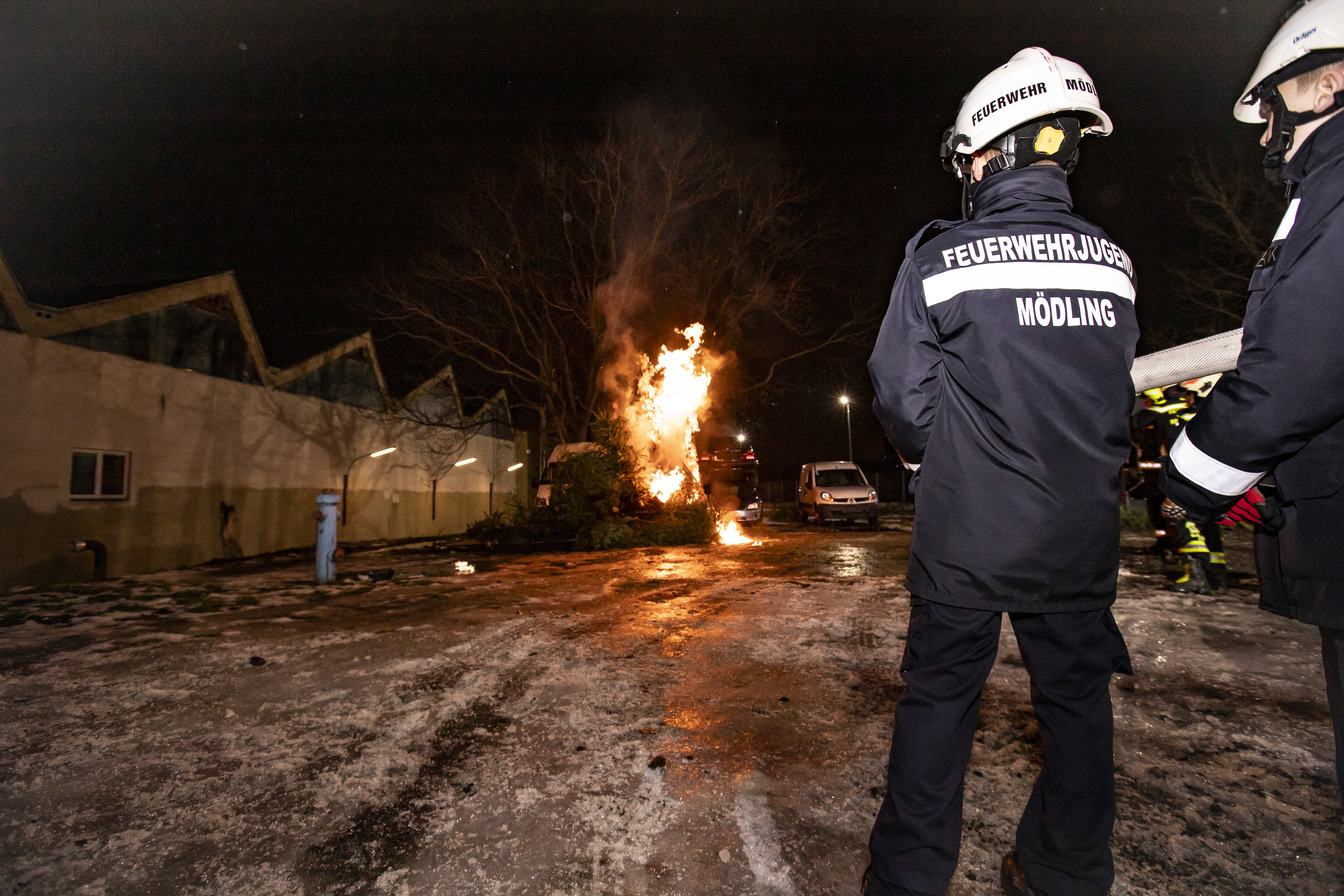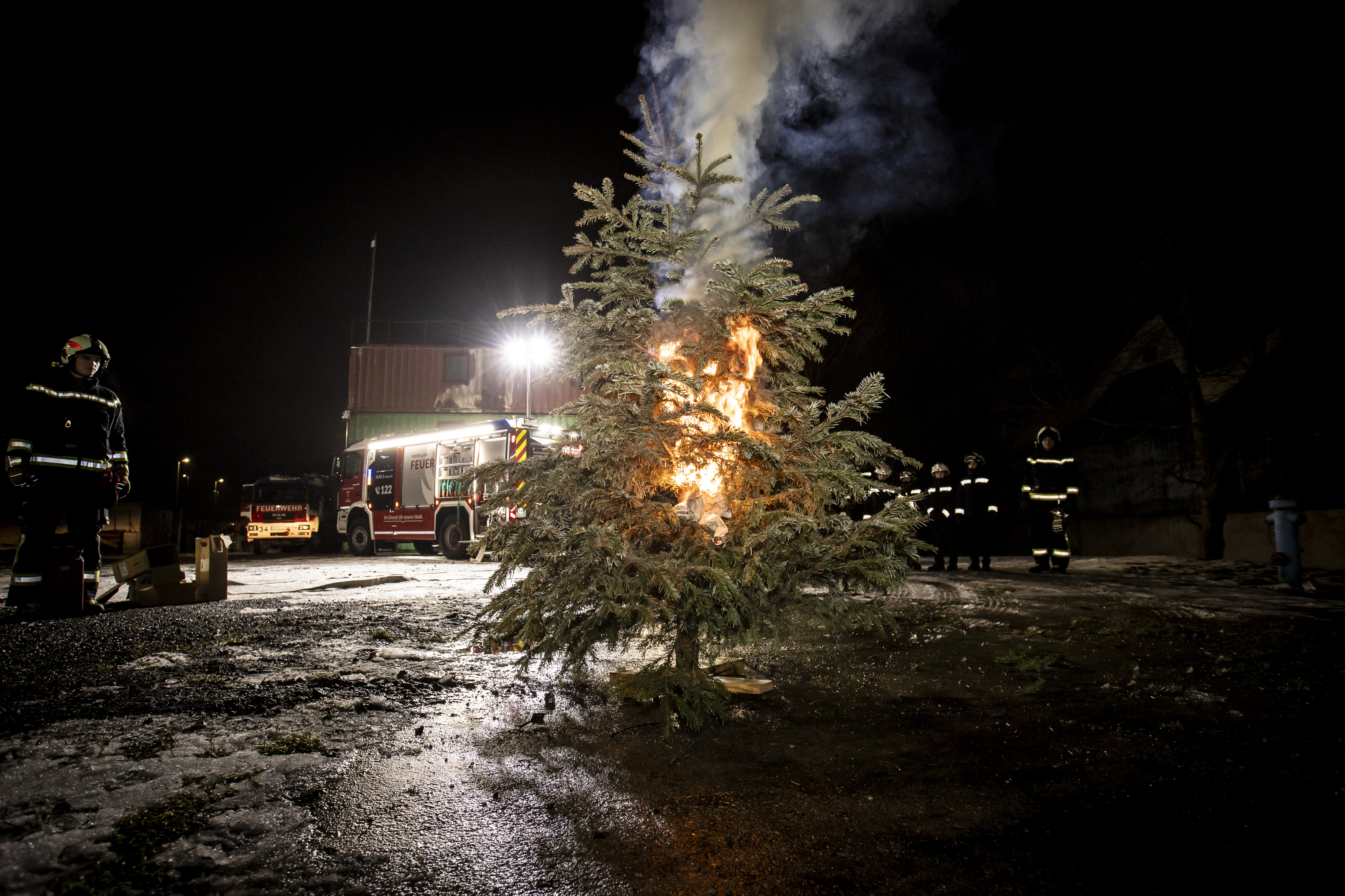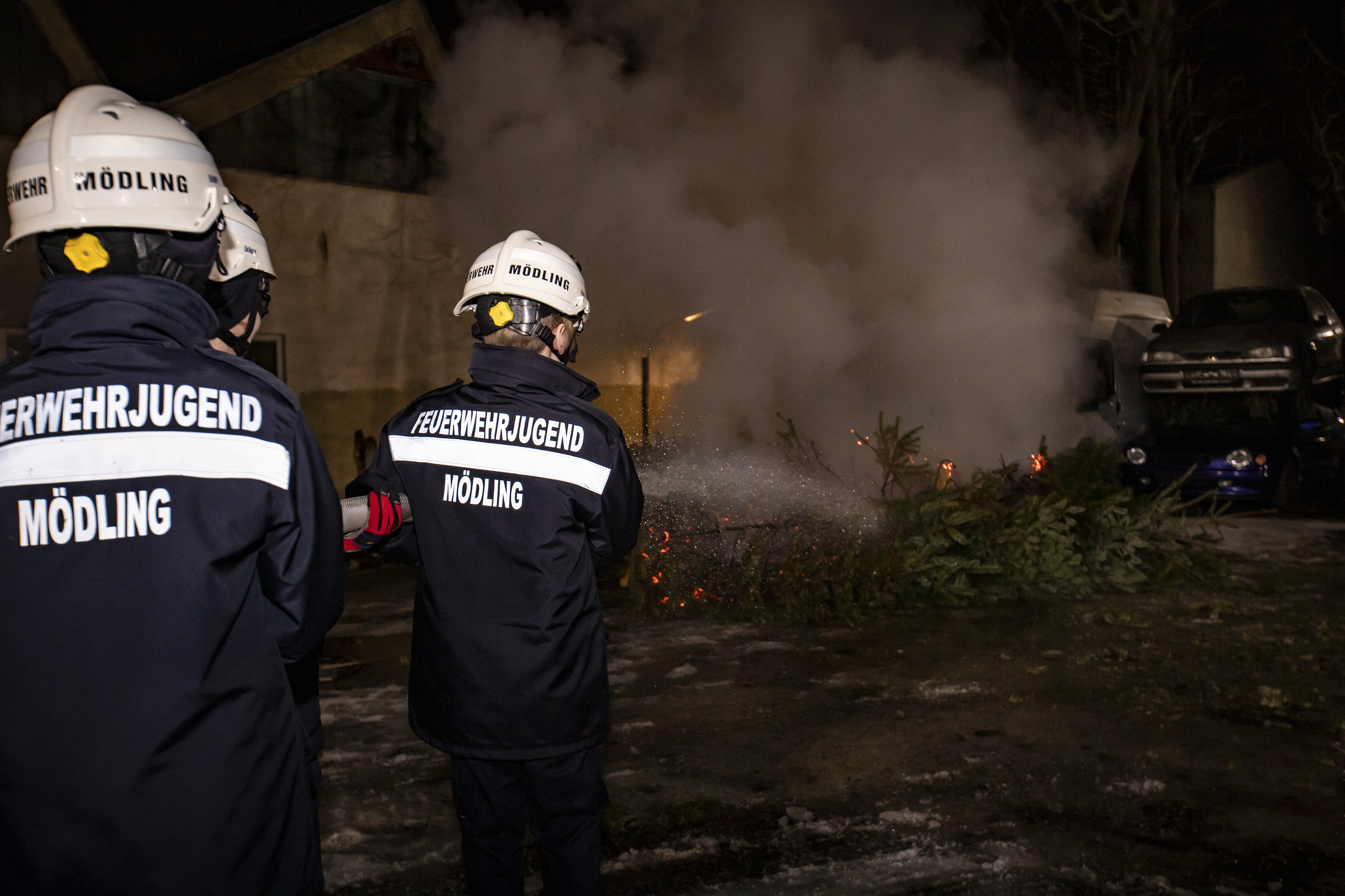 Am 28. Jänner stand eine praktische Übung zum Thema Brandbekämpfung am Programm. Als Brennmaterial dienten die entsorgten Christbäume, der Mödlingerinnen und Mödlinger. Bevor es jedoch ans Löschen ging, demonstrierten die Ausbilder, wie schnell ein Baum Feuer fängt. Dafür wurde ein brennendes Stück Papier im Geäst platziert. Es dauerte keine 10 Sekunden, bis der Christbaum lichterloh brannte.