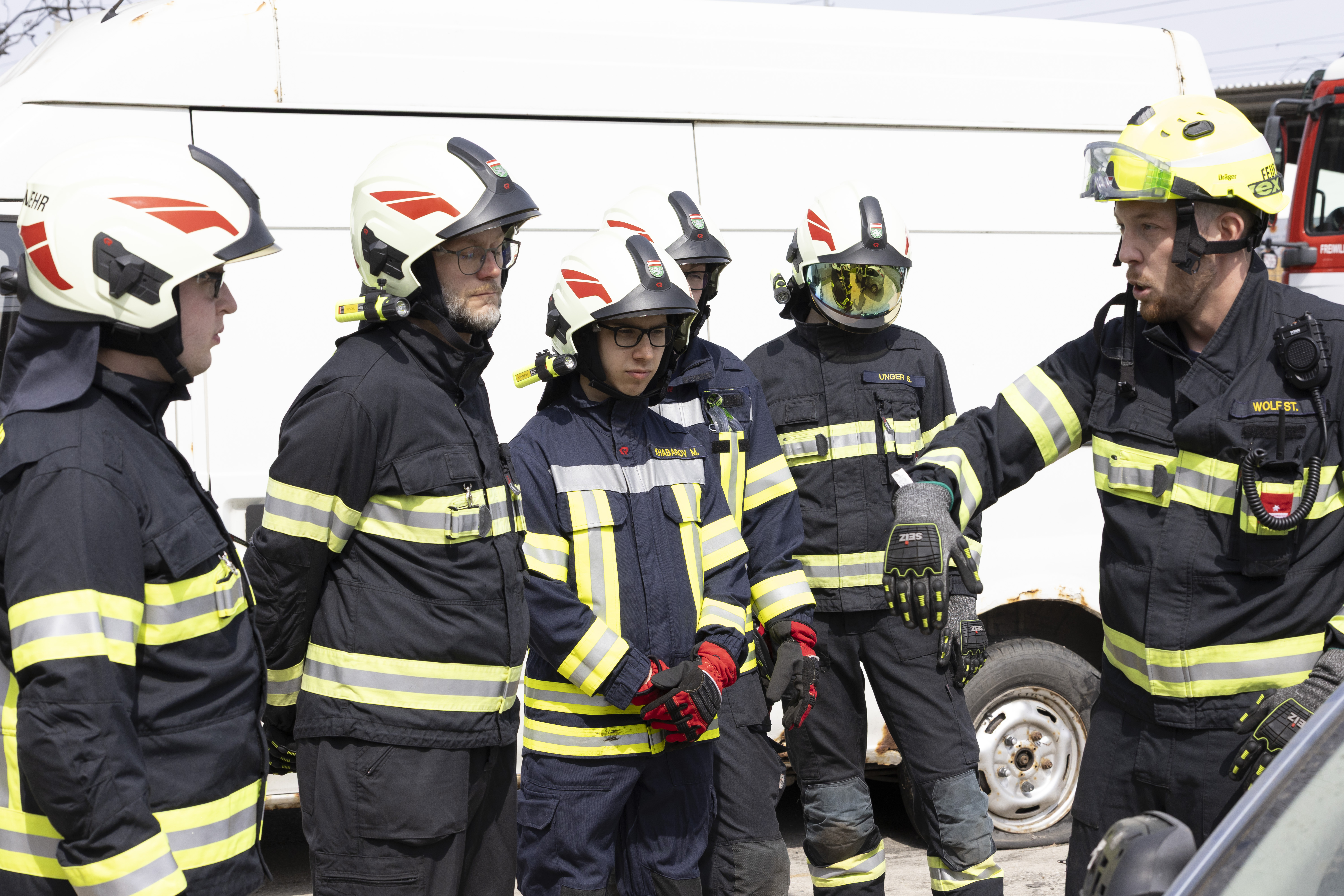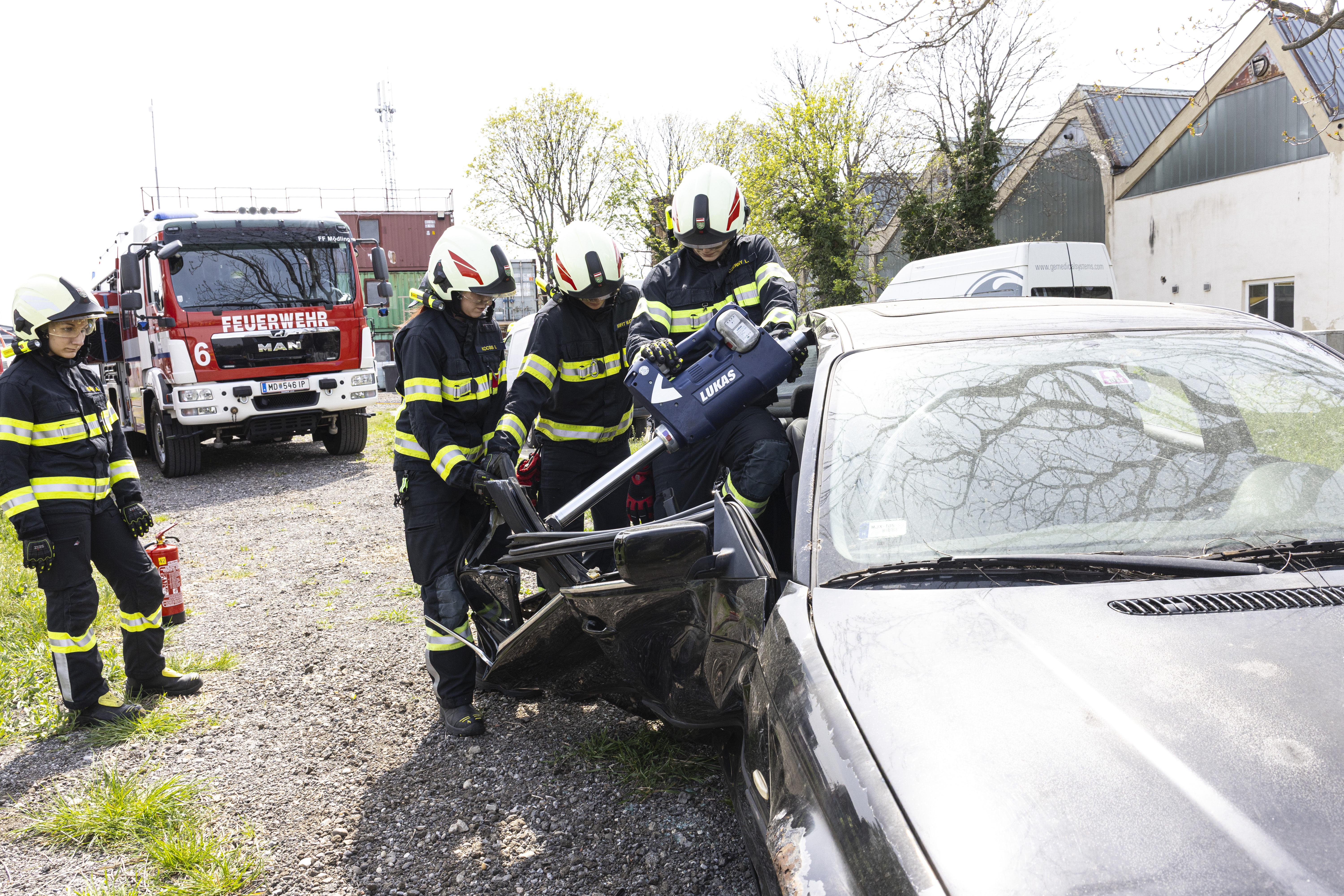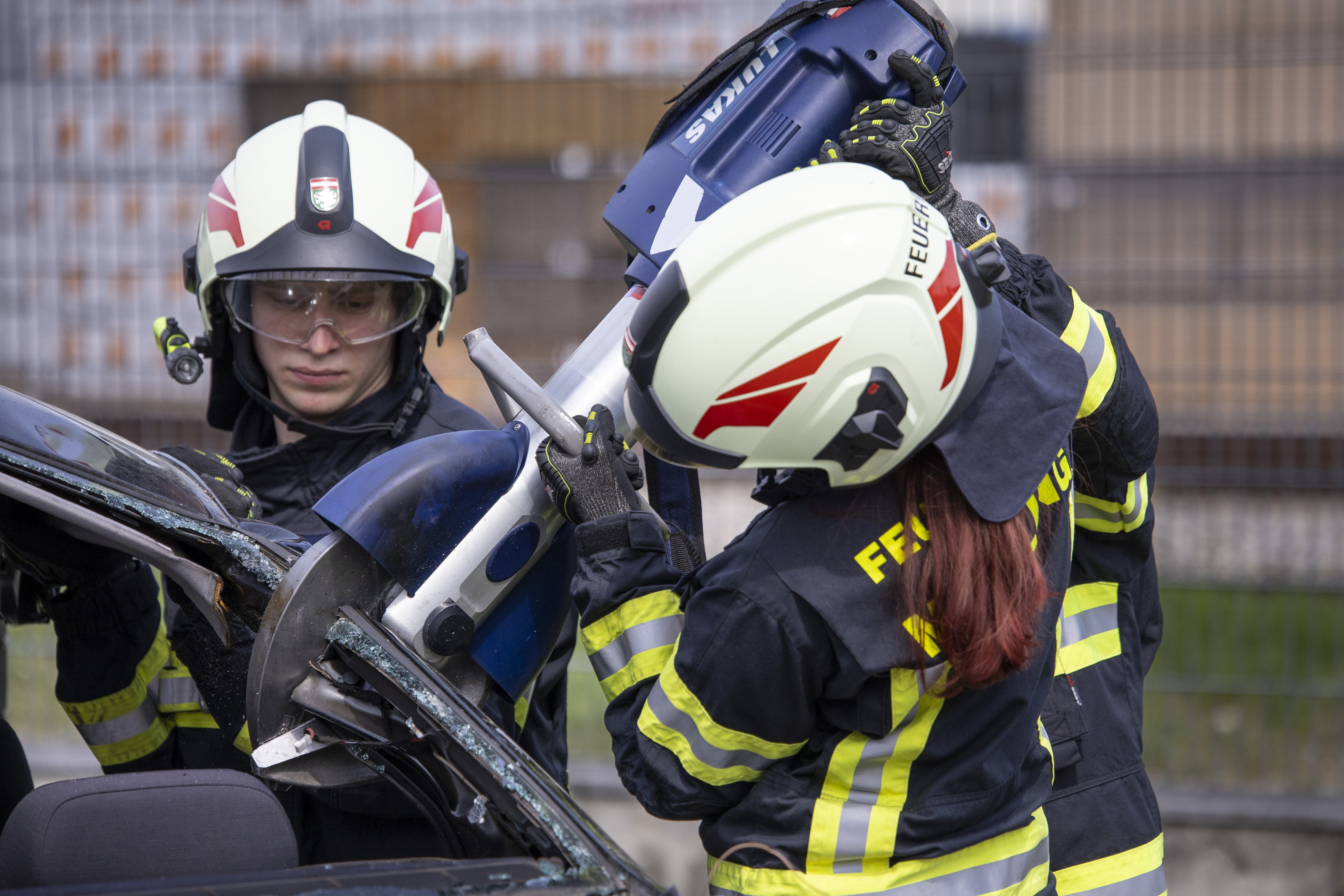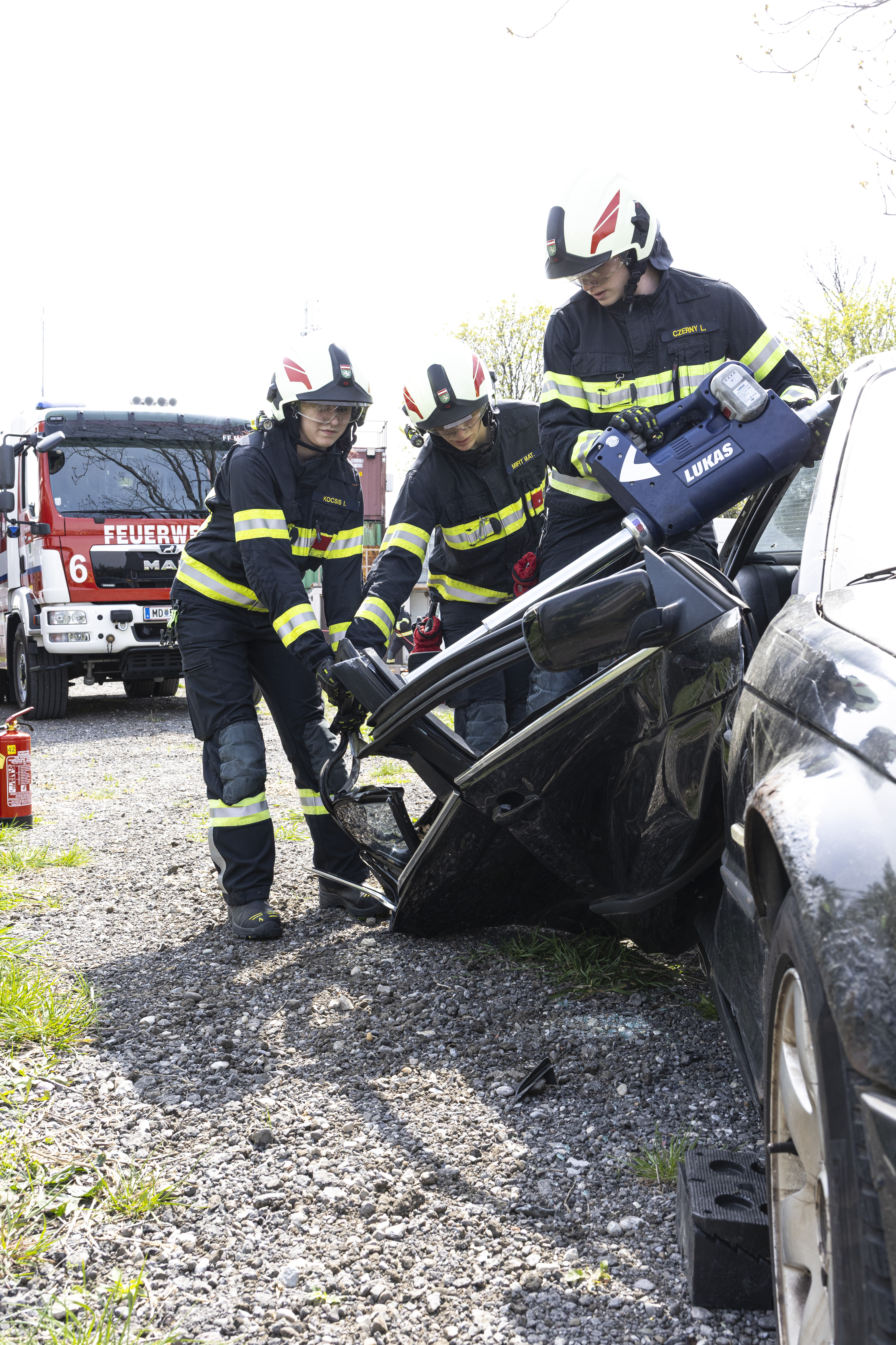 Bereits gegen 07:30 Uhr konnte Zugskommandant Paul-Thorwald Fastner, als Hauptverantwortlicher für das neue Ausbildungskonzept der Grundausbildung, zehn TeilnehmerInnen und drei Ausbilder im Lehrsaal begrüßen. Nach einer kurzen Theorieeinheit zu den Grundlagen des technischen Einsatzes stand bereits praktisches Arbeiten auf dem Programm. Neben der Fahrzeug- und Gerätekunde, dem Aufbau eines Geräteablageplatzes und dem Sichern und Stabilisieren von Unfallfahrzeugen, wurden am Vormittag auch bereits erste Grundlagen zur Menschenrettung an einem Unfallfahrzeug praktisch veranschaulicht. Nach einem gemeinsamen Mittagessen wurden die TeilnehmerInnen in zwei Gruppen aufgeteilt und konnten in über zwei Stunden mit den Ausbildnern Wolfgang Freiler, Stefan Wolf, Florian Steiner und Michael Buhn die technische Menschenrettung an Unfallfahrzeugen praktisch beüben. Besonders im Mittelpunkt stand das sichere Arbeiten mit den hydraulischen Rettungsgeräten. Die Schaffung einer kleinen und großen Seitenöffnung bis hin zur Dachabnahme konnten praktisch erlernt werden. Im Anschluss folgte die letzte Einheit des Tages in welcher der Umgang mit Hebekissen gefestigt wurde.