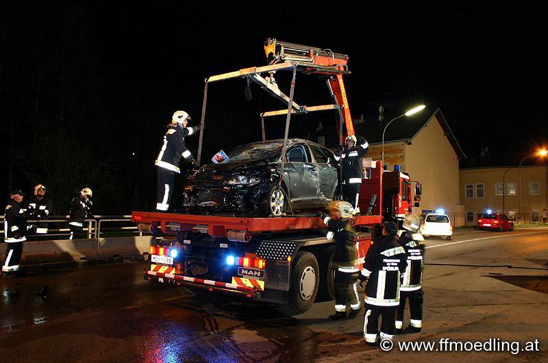 Um 23:03 Uhr wurde die FF Mödling zu einer Menschenrettung nach Verkehrsunfall alarmiert. Der Hausmannschaft, die innerhalb einer Minute ausgerückt war, bot sich am Einsatzort ein groteskes Bild. Das verunfallte Fahrzeug stand eingeklemmt, zwischen einer Betonleitwand und dem Geländer zum Mödlingbach, beinahe senkrecht auf dem Gehsteig. Die Fahrerin hatte sich zu diesem Zeitpunkt schon selbst befreien können.